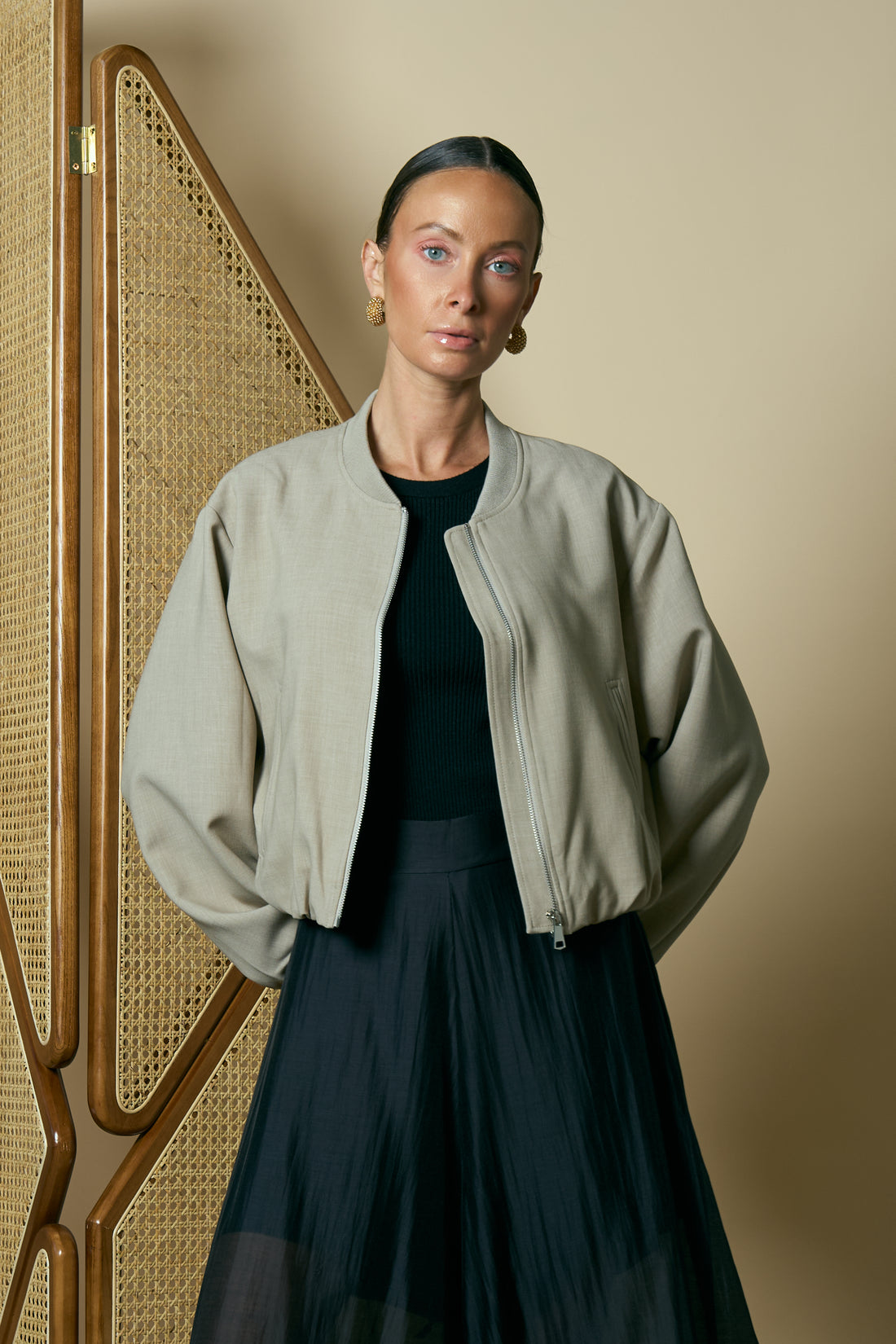 Anna bomber jacket in a sand hue, featuring a front zipper closure, side pockets and...