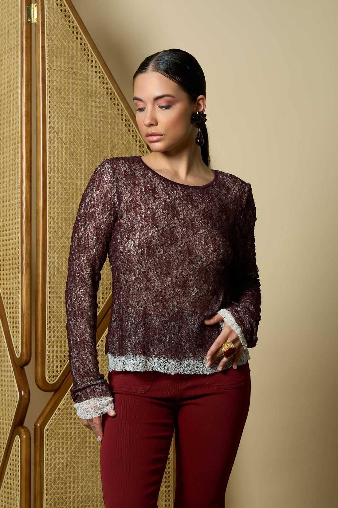 Long-sleeve burgundy mesh top with a white inner lining for a layered, stylish look.