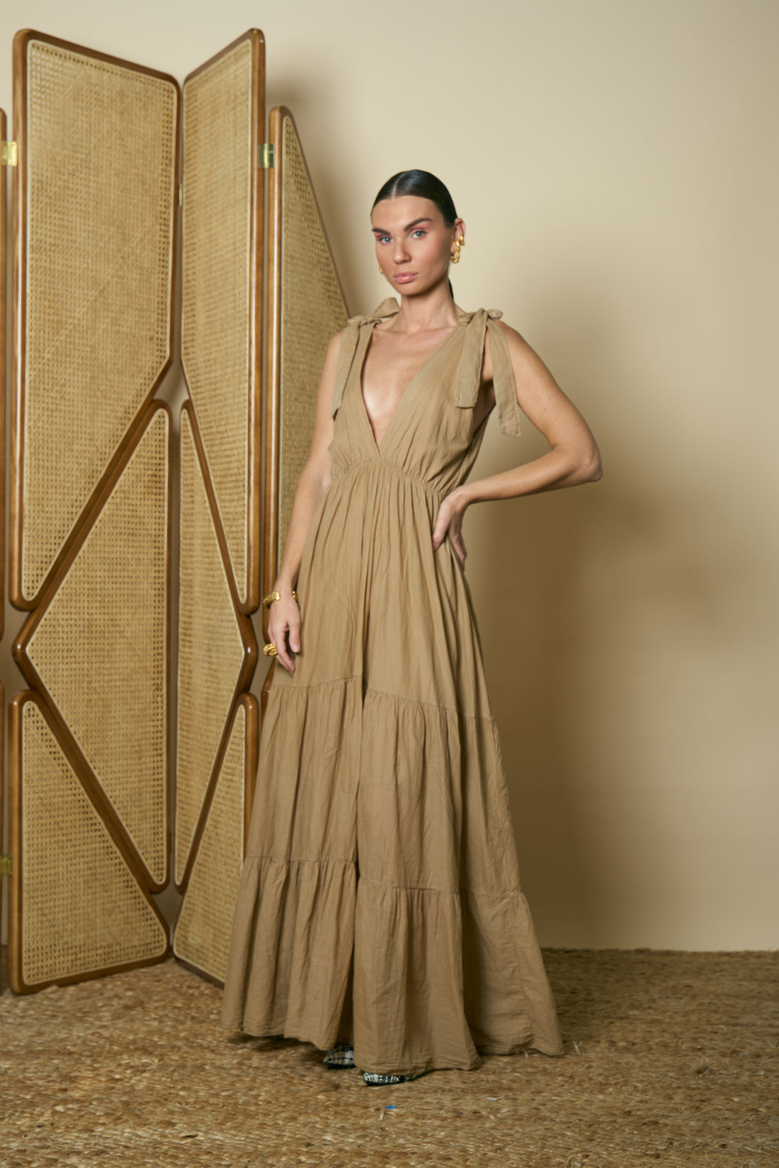 Long airy mocha-colored cotton dress featuring adjustable tie straps at the shoulders for a soft...
