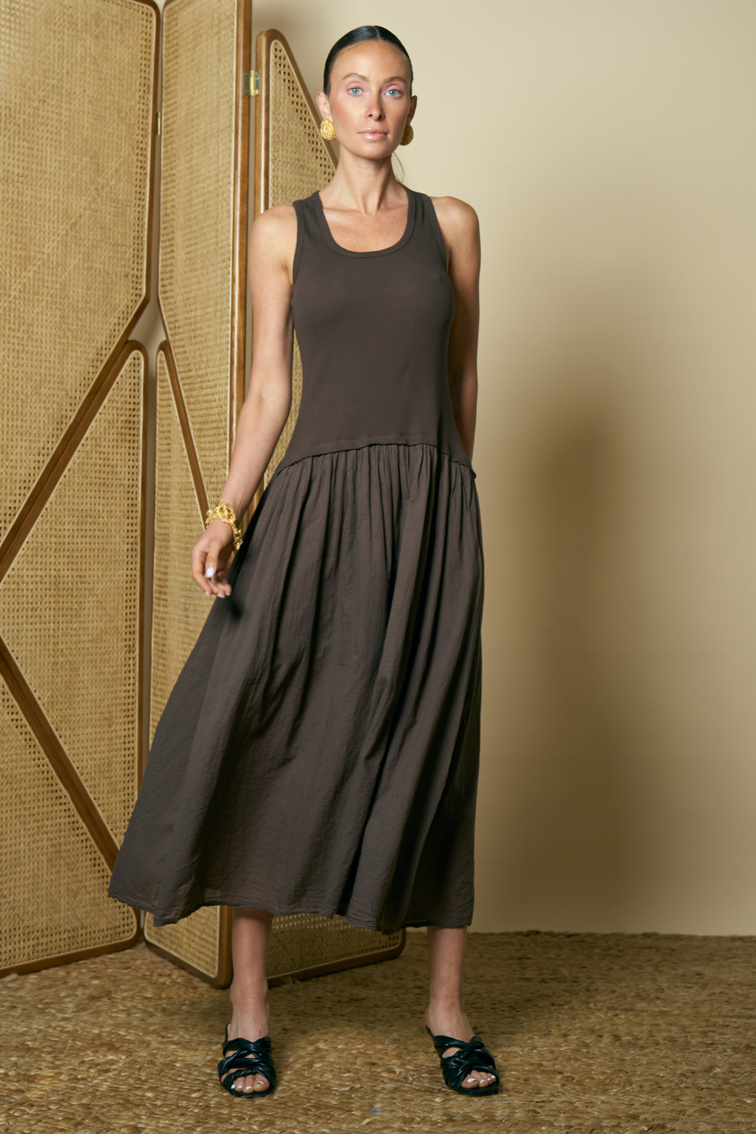 Sleeveless dress in chocolate brown, featuring a knit shirt-style top and a cotton skirt blending...