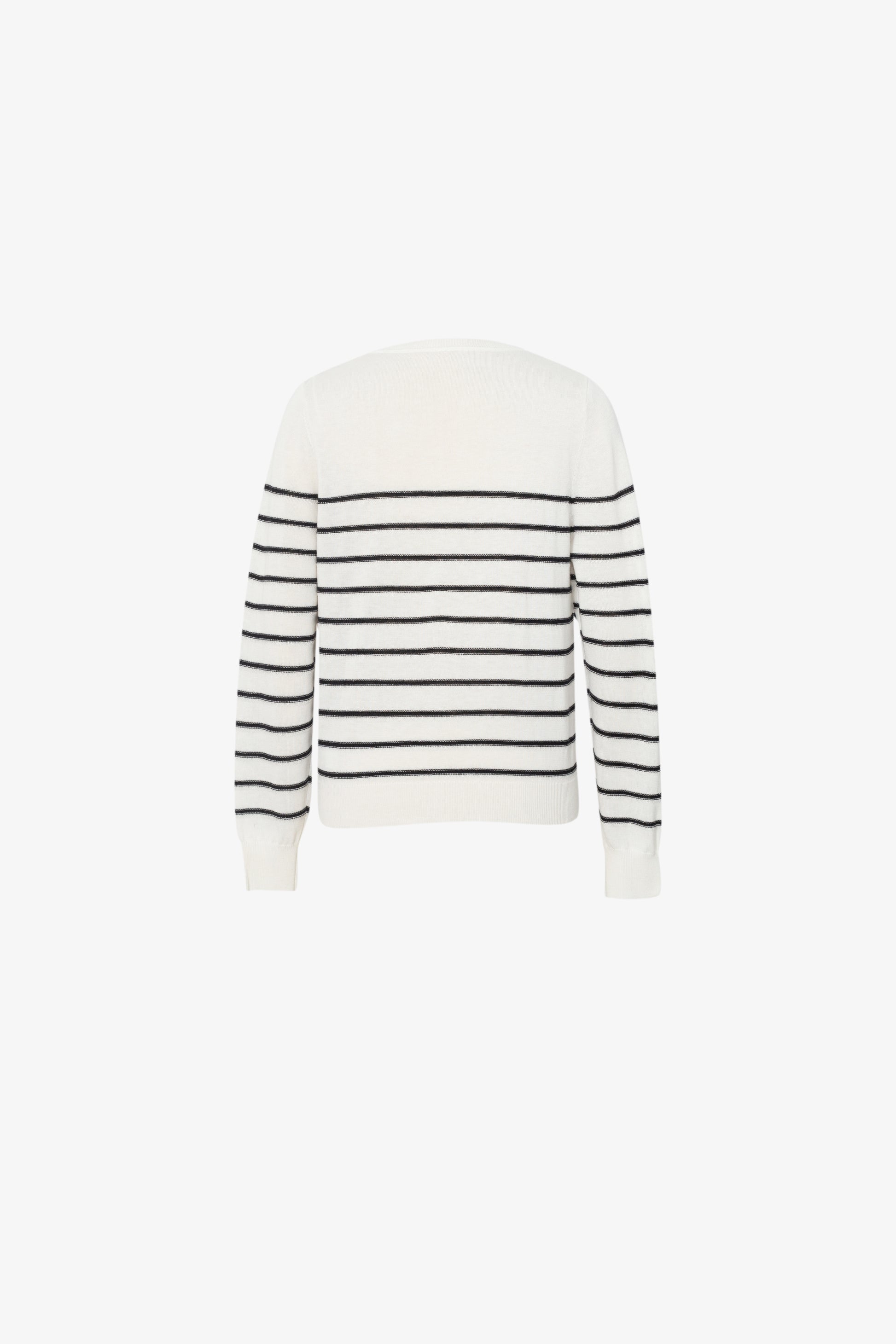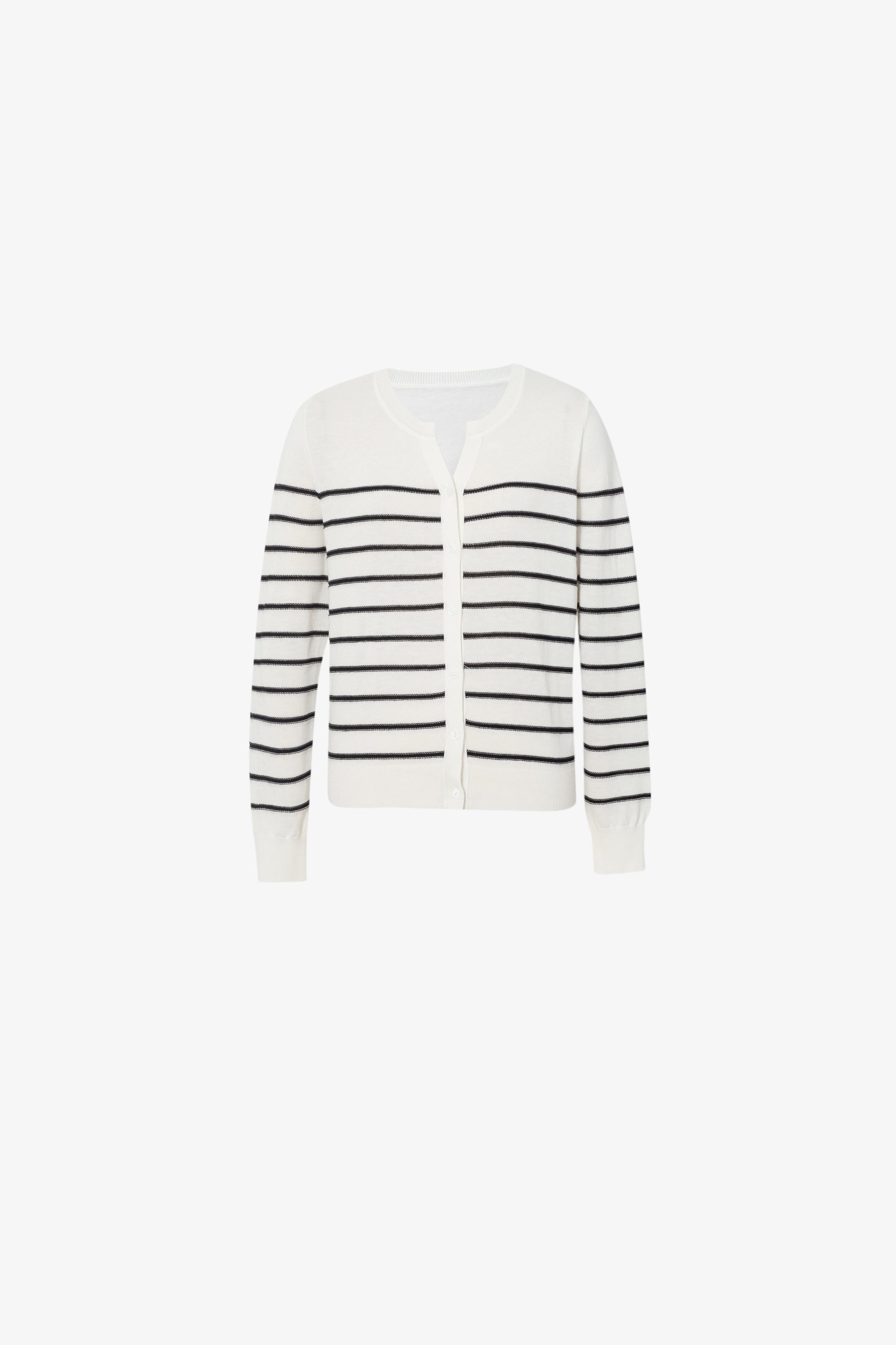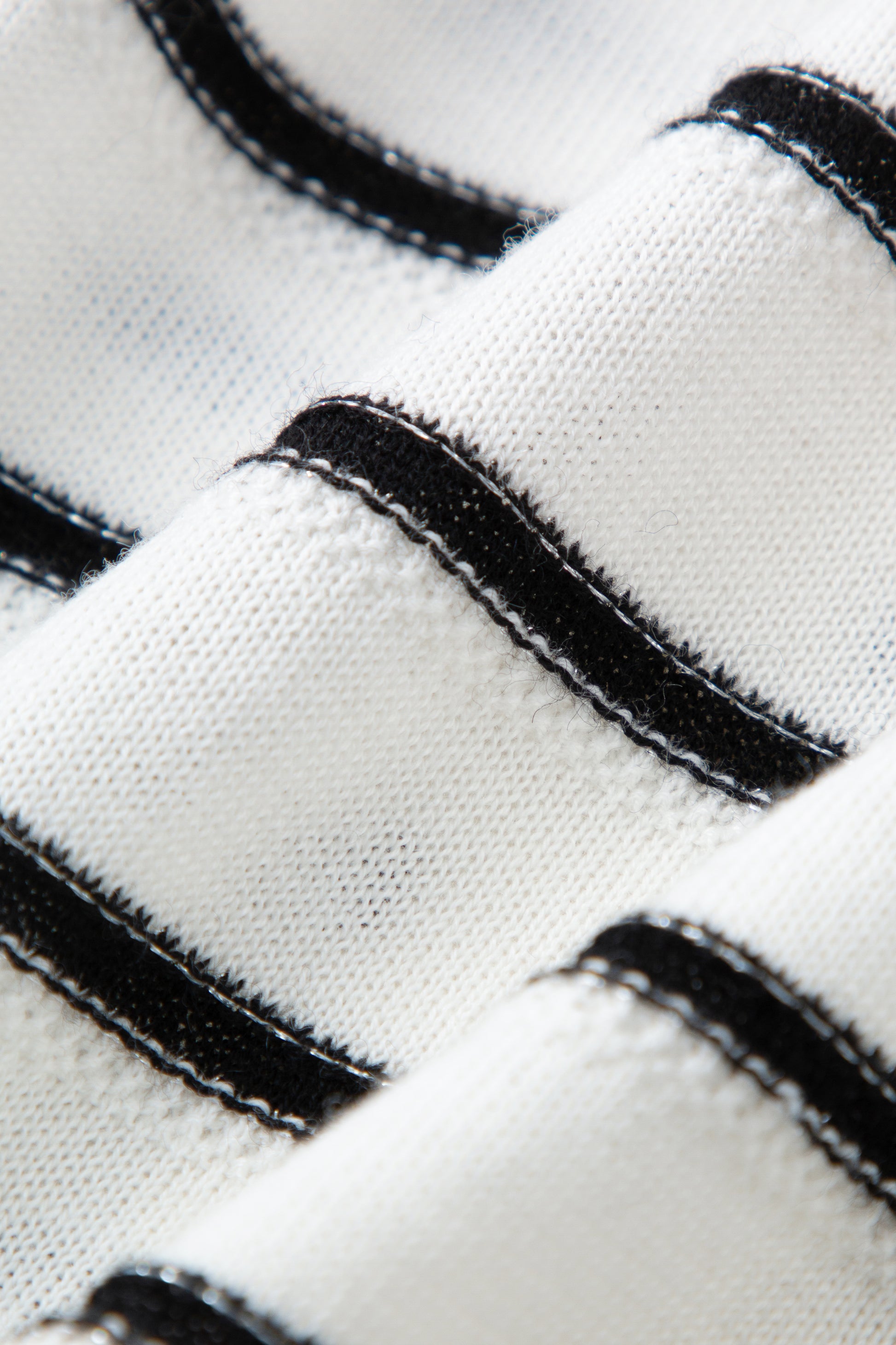 This top features a stylish V-neck design that highlights the collarbones and accentuates the neckline. The use of black and white stripes, carefully crafted from the body of the shirt to the sleeves, creates a slimming effect for a visually appealing silhouette. The loose and straight fit flatters all body types, providing an overall slim and tall appearance. The button placket is made with high-quality mother of pearl, polished to create a lustrous shine and a warm touch.