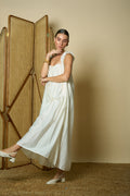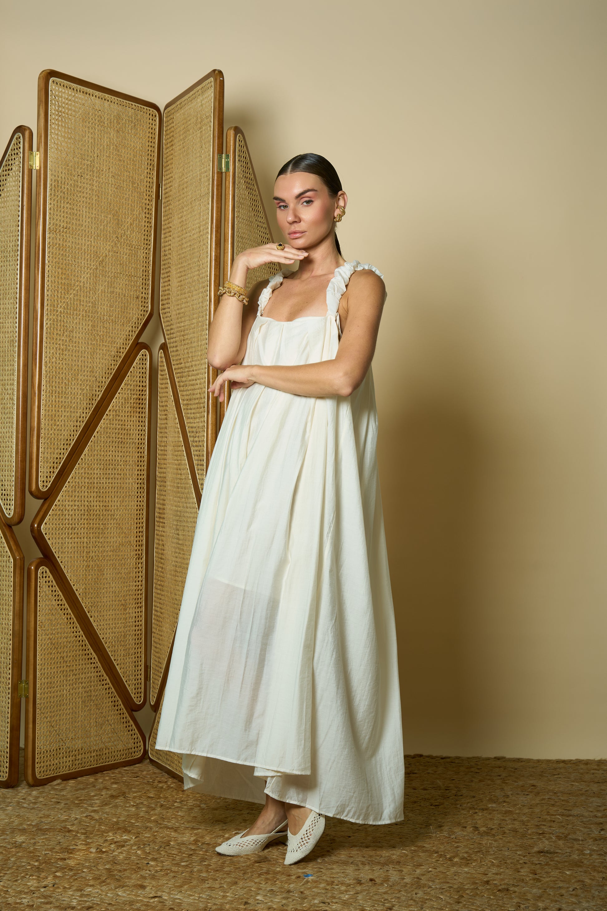 Fluid off-white silk and riffled straps for a timeless feminine look.