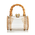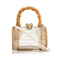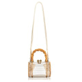 Handwoven rattan and acrylic bag. Bamboo handle and removable leather shoulder strap. Can be used as a shoulder bag, crossbody or handbag.