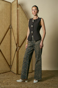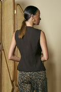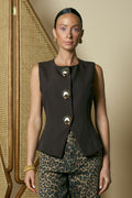 Mocha-colored sleeveless vest with a round neckline, featuring three oversized shell buttons for a chic, elegant touch.