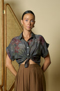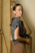 Short-sleeve button-up top with a tie waist for a flattering fit.