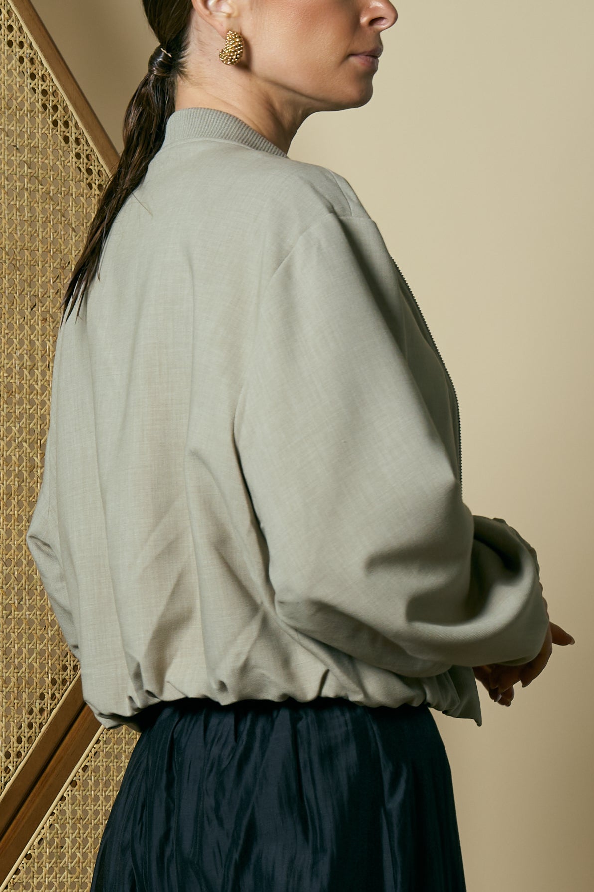 Anna bomber jacket in a sand hue, featuring a front zipper closure, side pockets and long sleeves with elastic cuffs for a comfortable sporty-chic finish