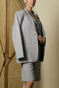 Sand-colored oversized blazer featuring white stitched detailing along the edges, combining relaxed tailoring with subtle, elegant accents.
