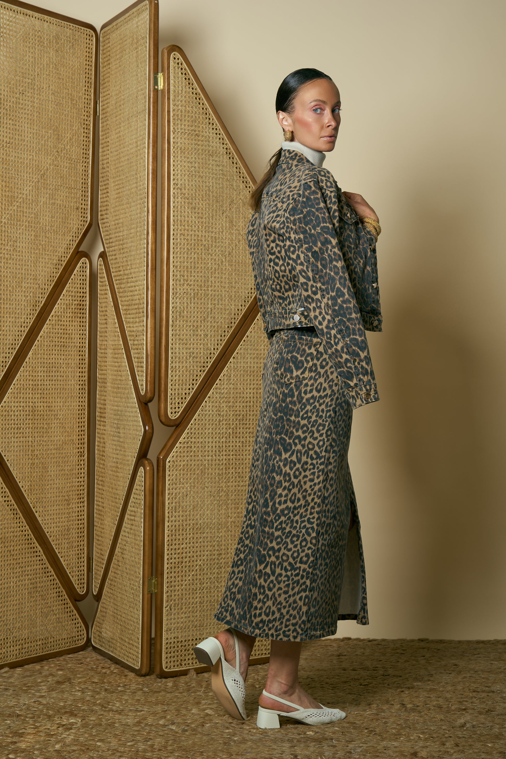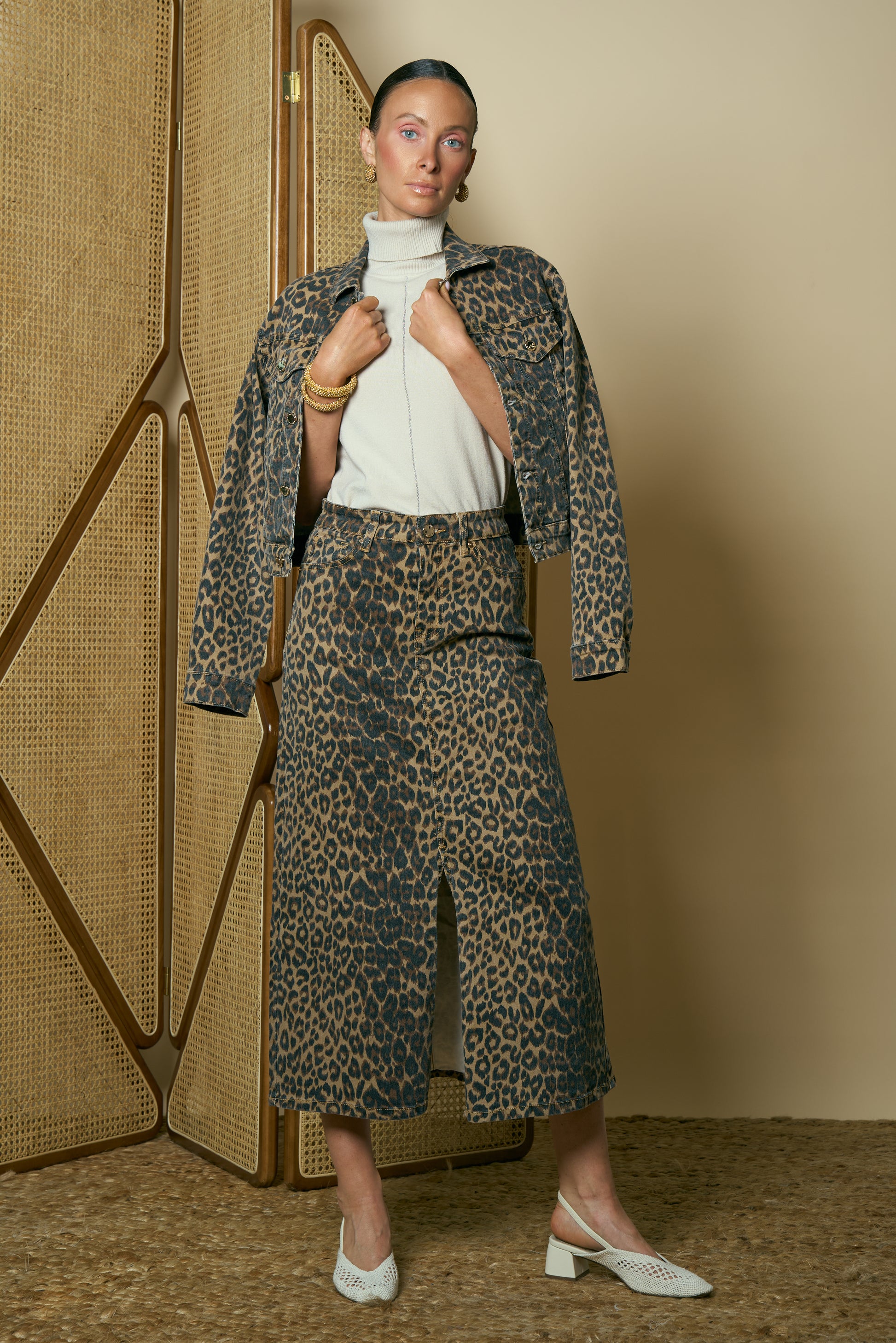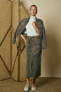 Midi denim skirt in animal print, designed with a front slit for a chic modern touch