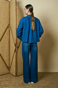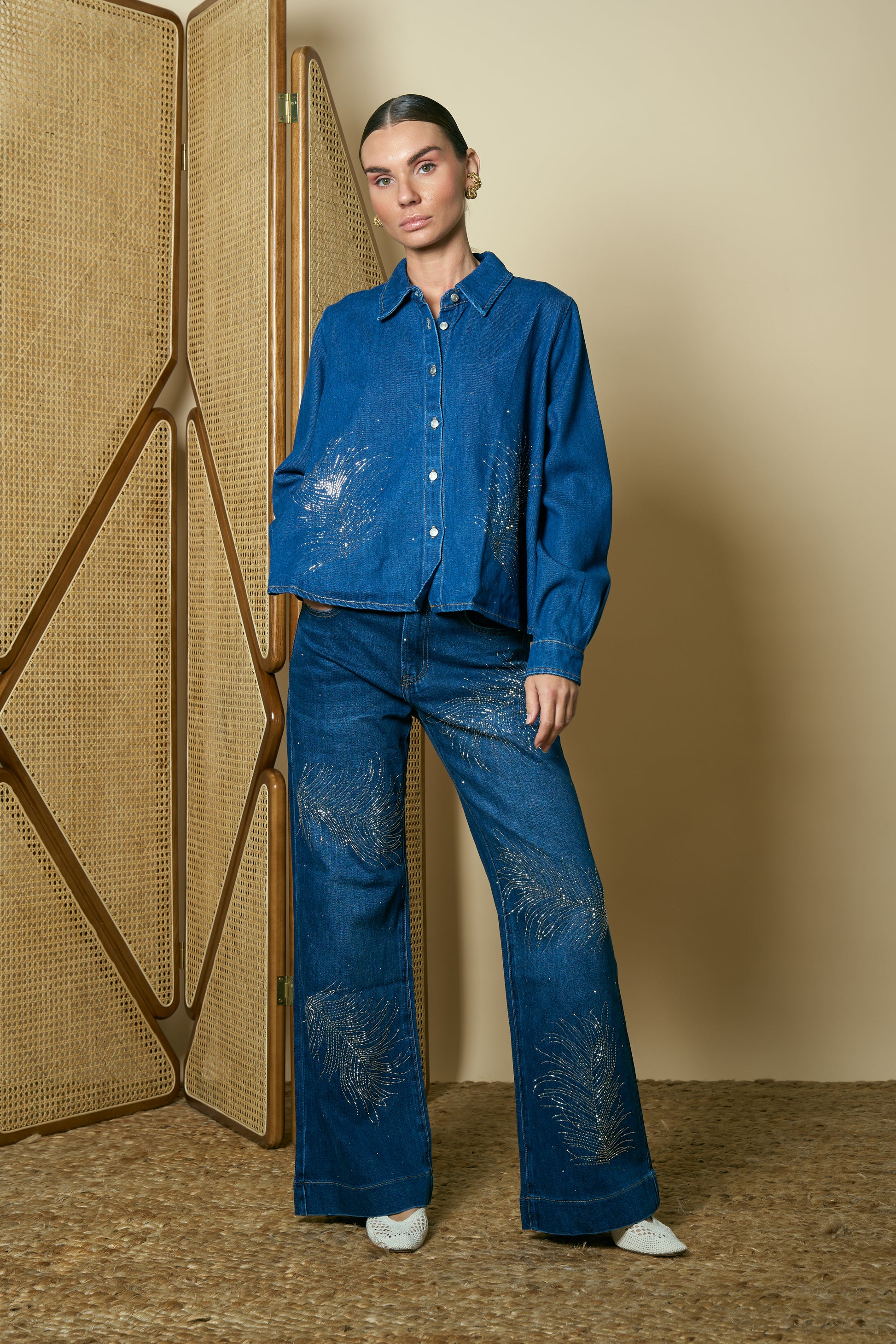 Blue denim jeans featuring crystal-embellished palm tress on the front for a playful yet glamorous touch.