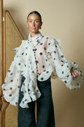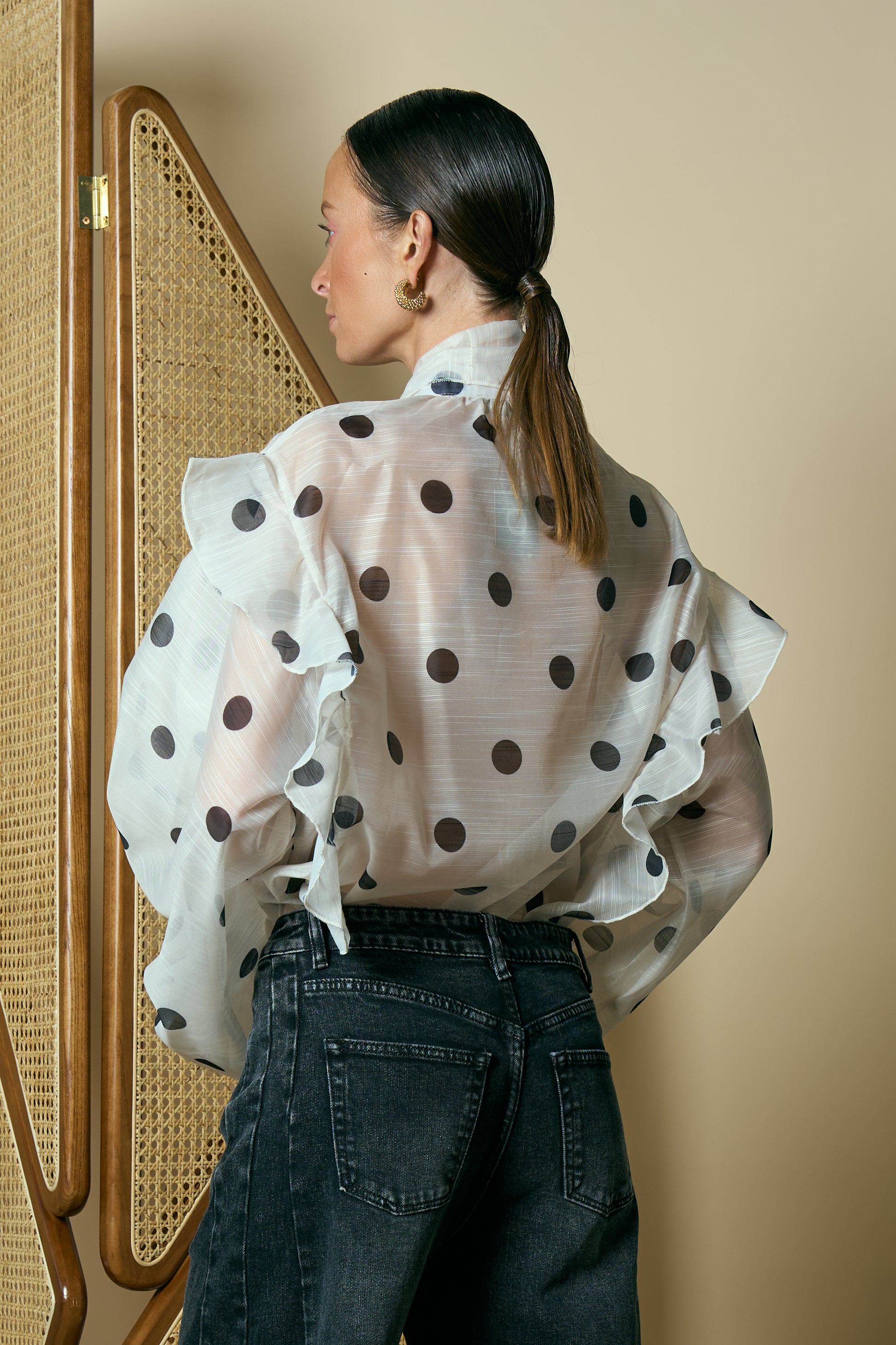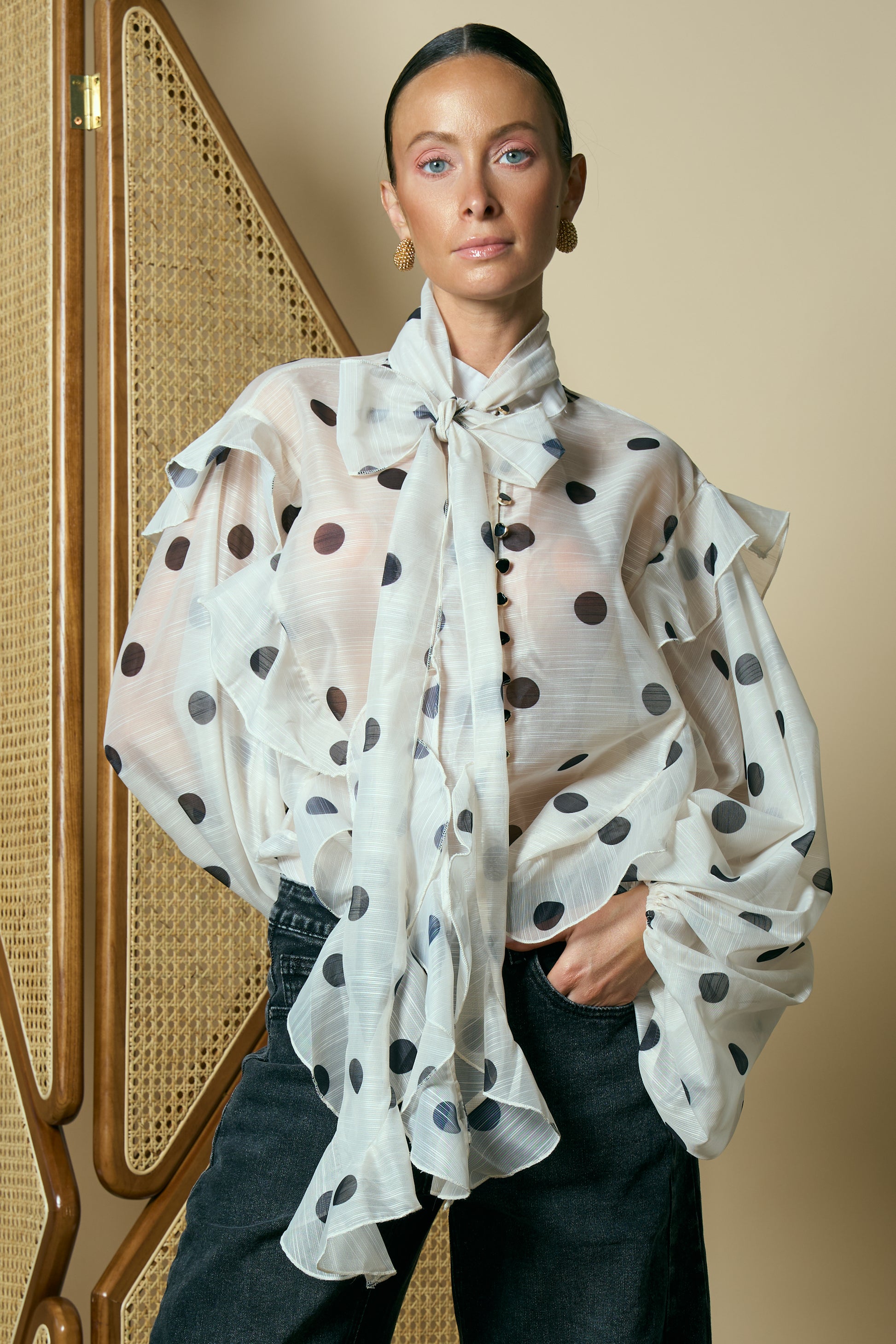 One-size polka dot blouse with ballon sleeves, a chic tie-neck detail and heart-shaped buttons for a playful stylish finish.