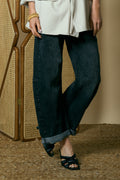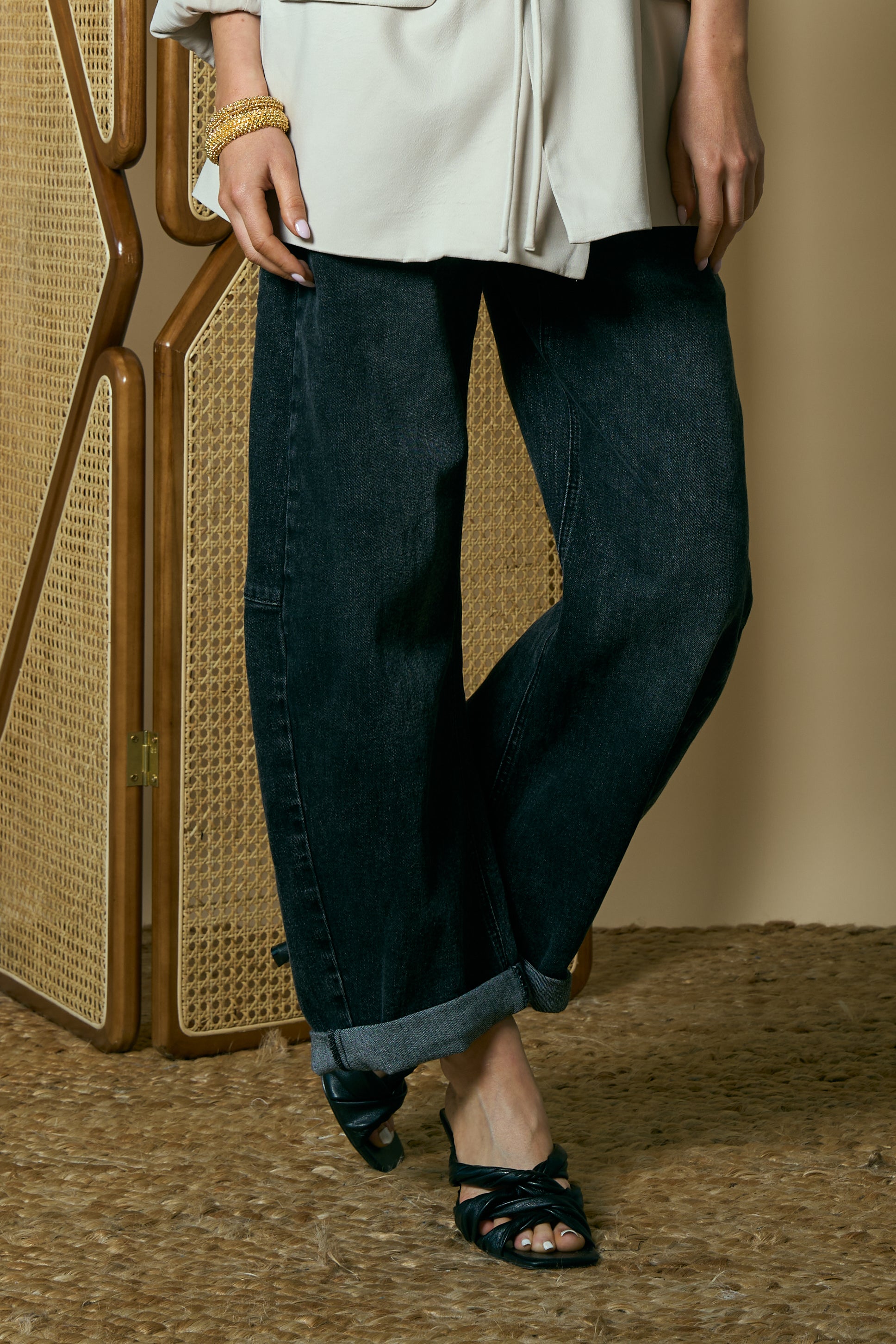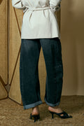 Graphite-colored barrel-leg denim pants featuring a relaxed, rounded silhouette and clean folded hem for a modern, effortlessly chic look.