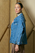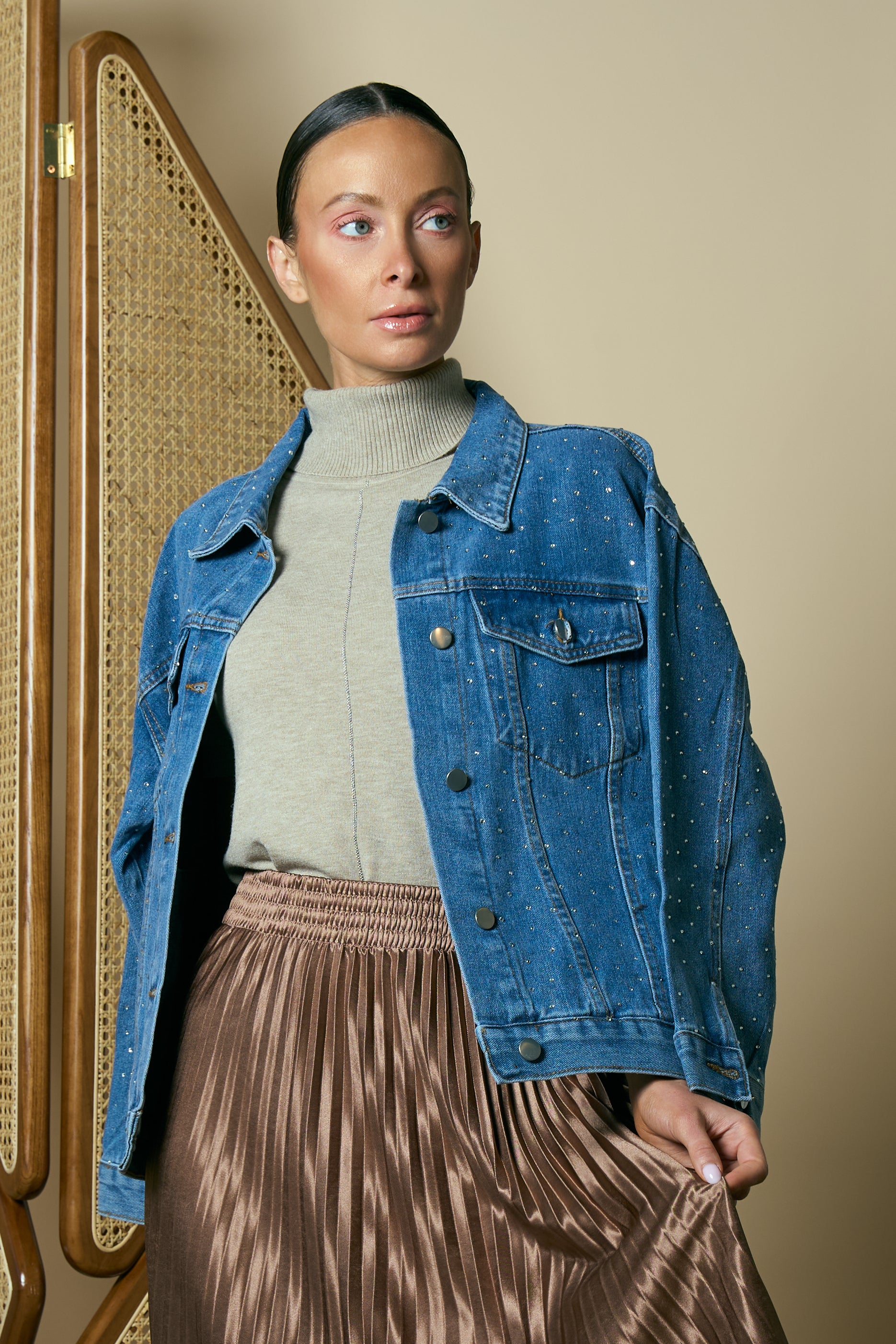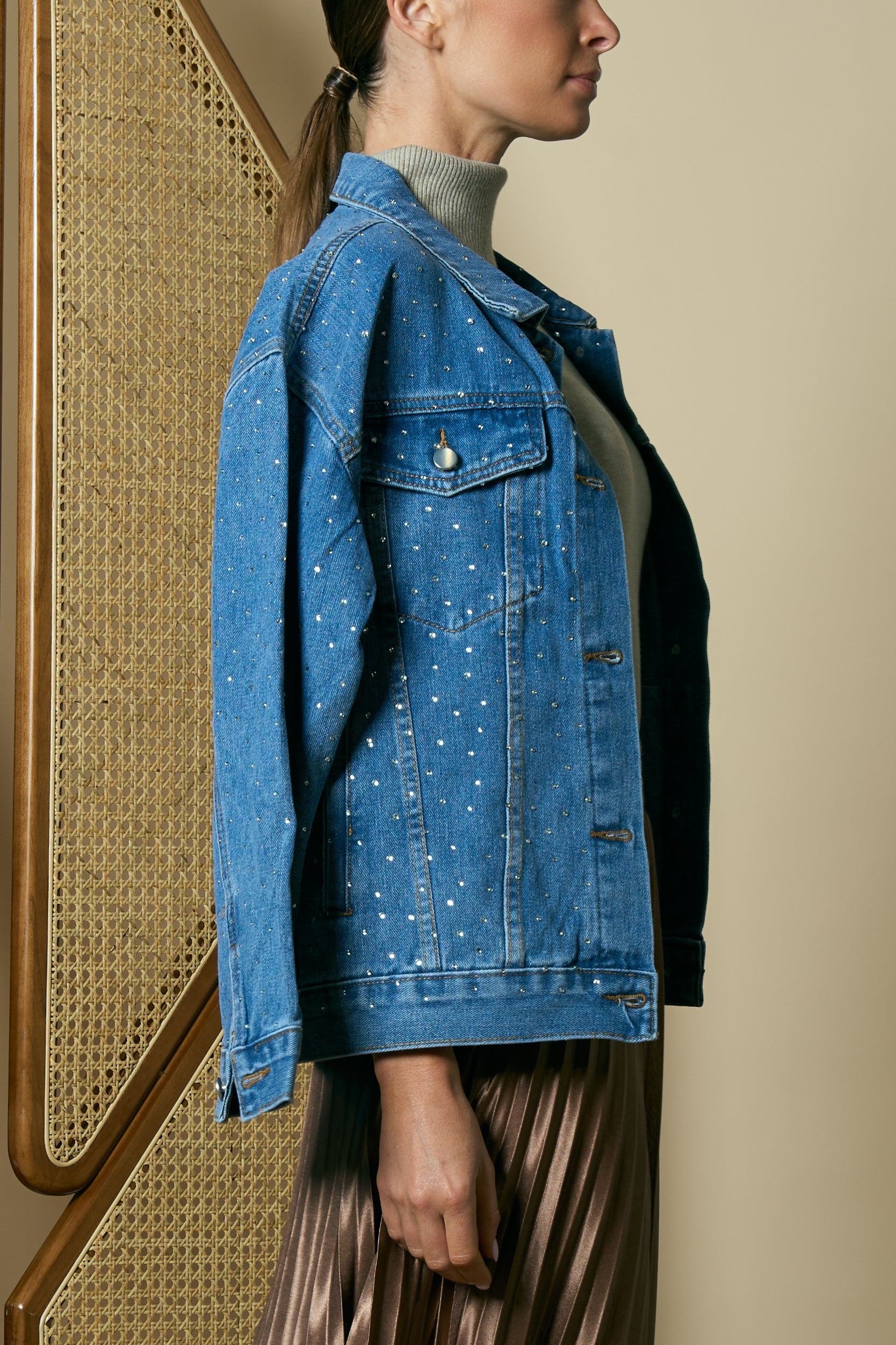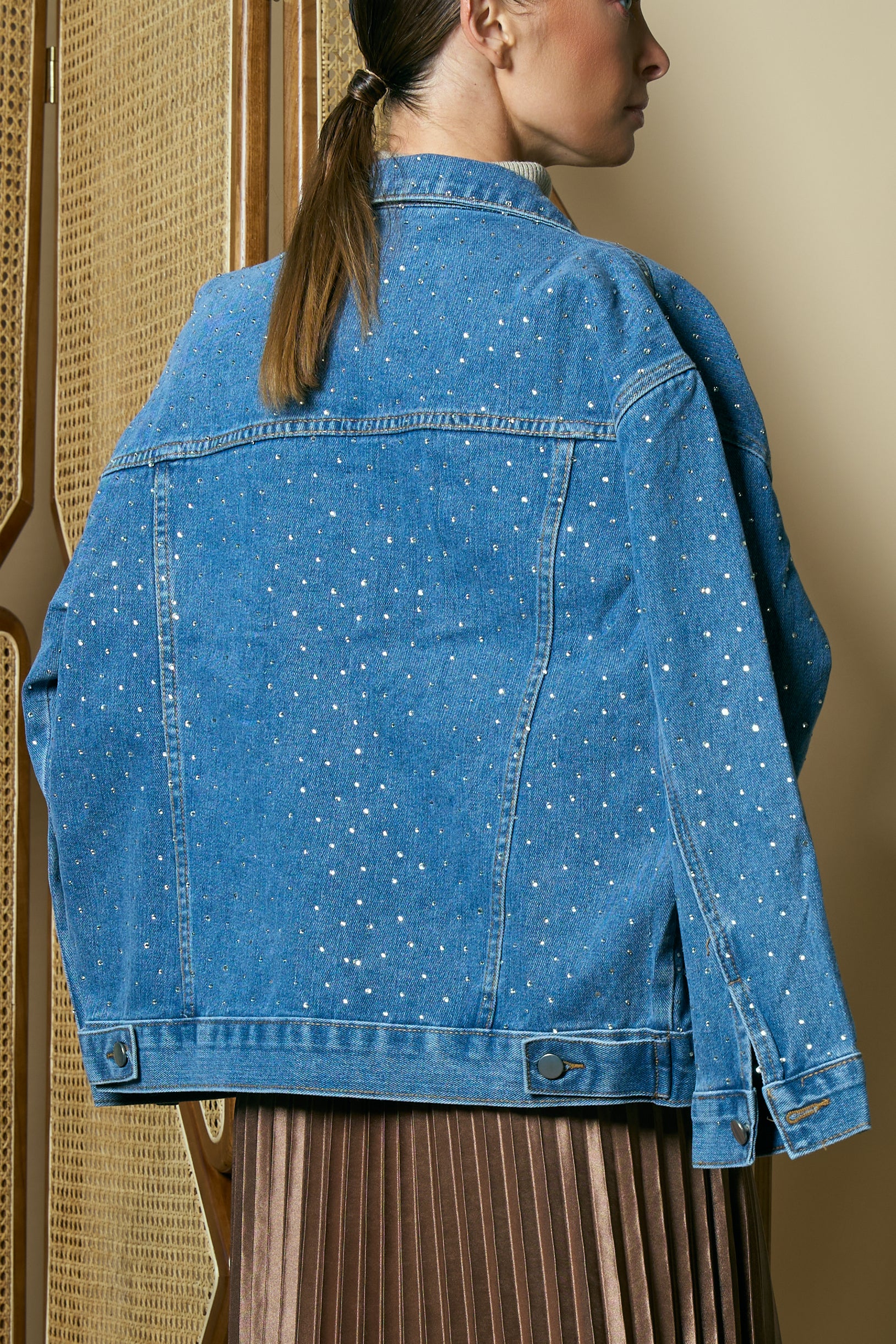 Denim jacket embellished with sparkling crystals, adding a touch of glamour to a classic wardrobe staple.