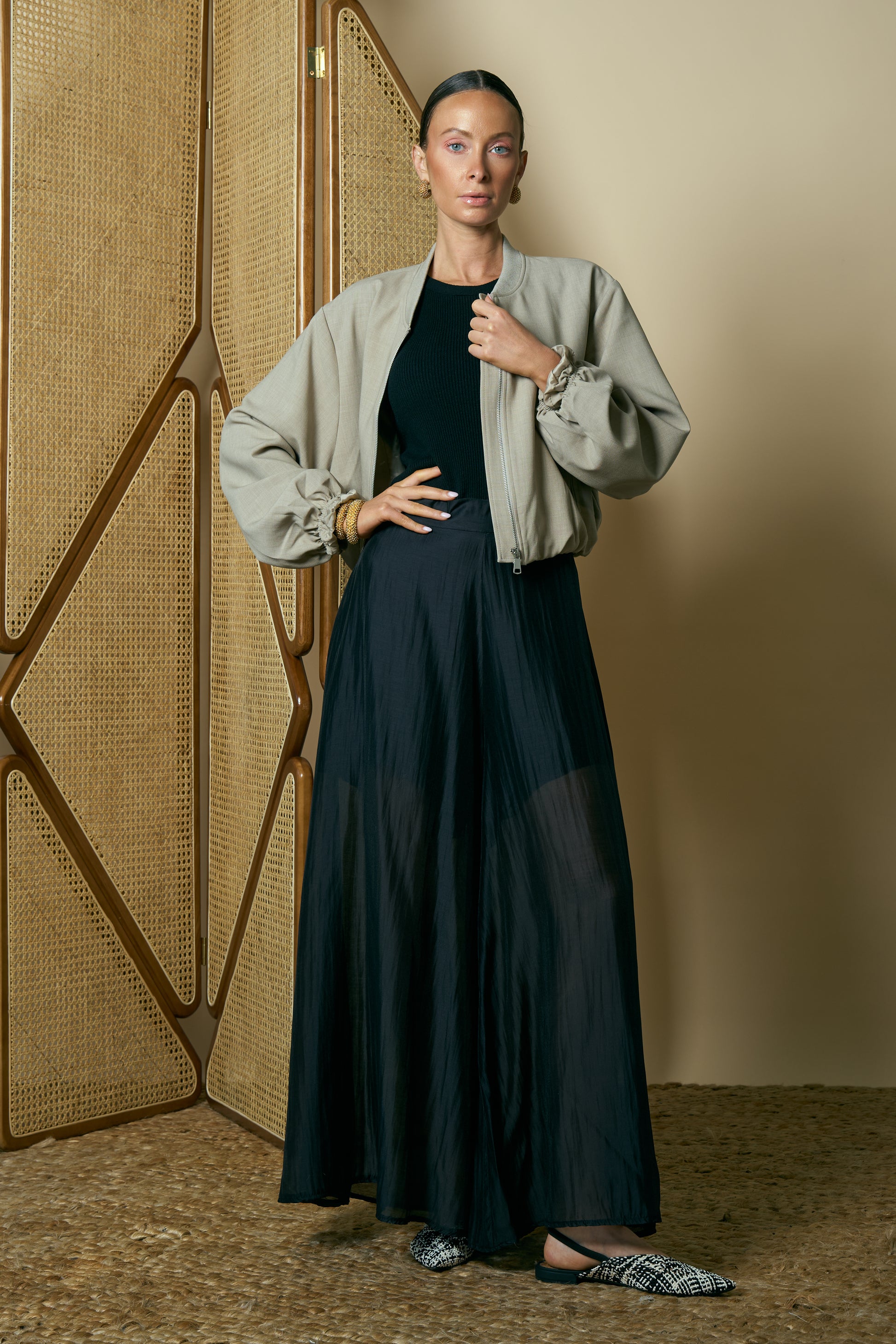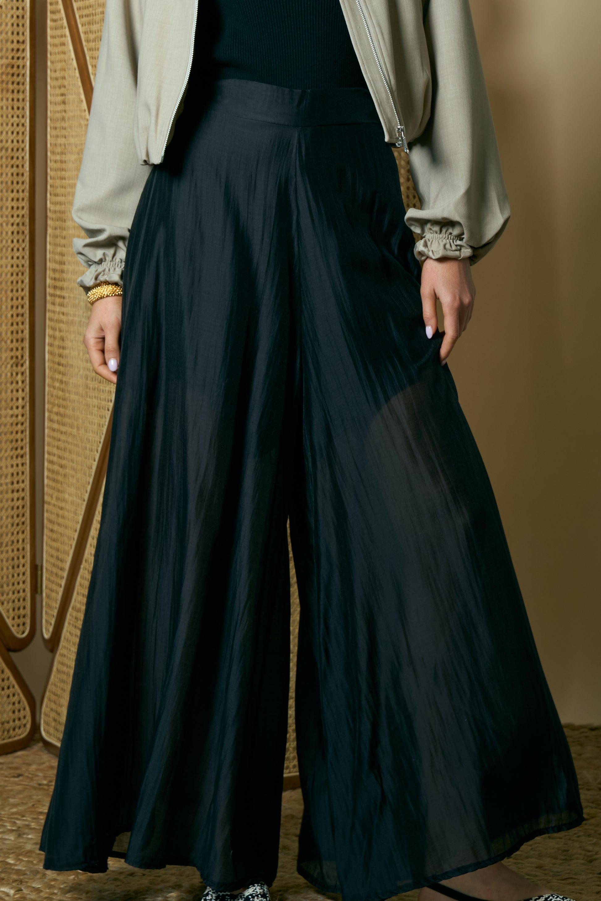 Sheer palazzo pants with a soft fluid drape and an airy, lightweight feel, offering effortless movement and an elegant sophisticated silhouette.