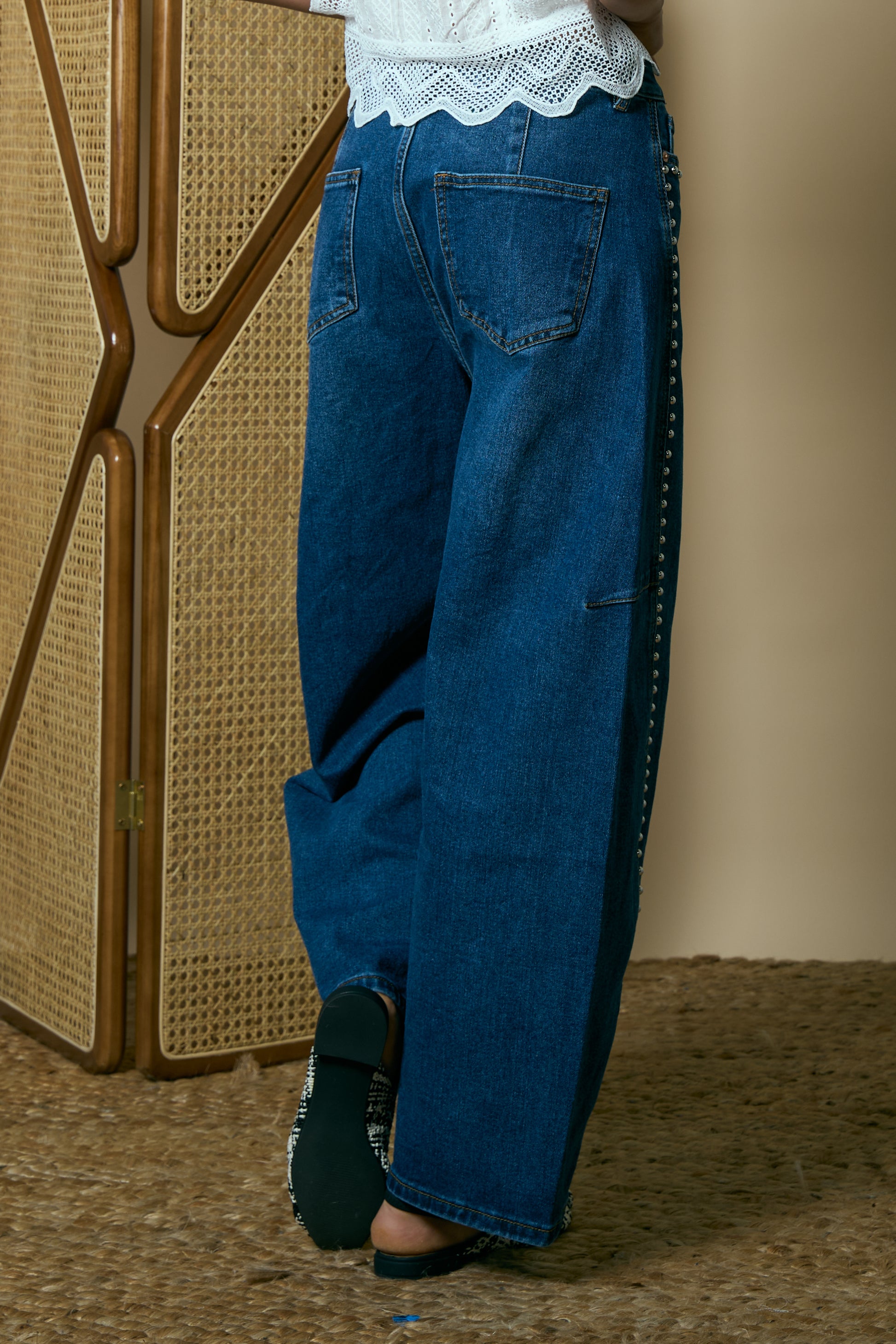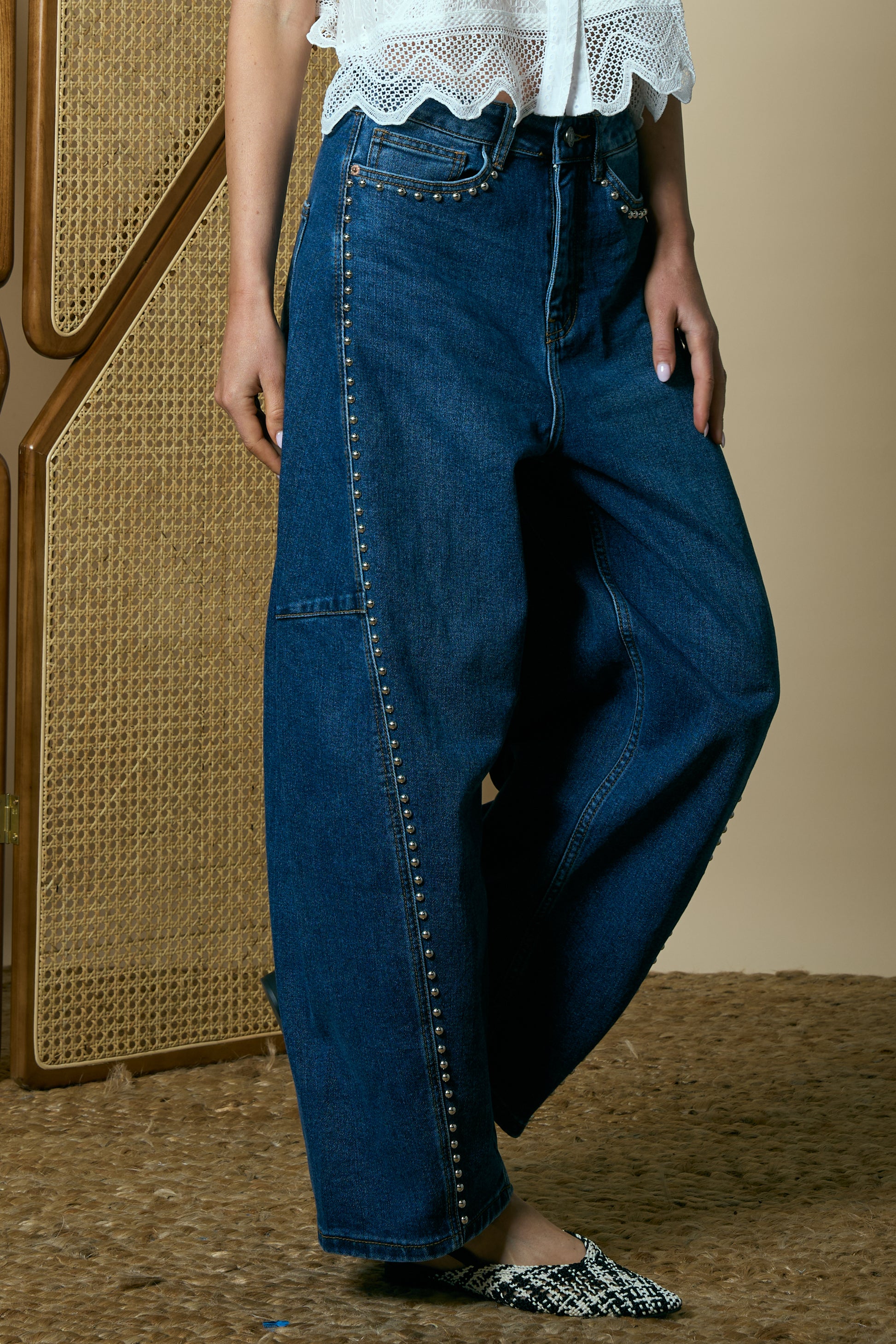Barrel-style jeans crafted from modern denim with a relaxed, wide-leg silhouette. Featuring metallic studs along the front for an edgy, urban touch. Mid-rise waits, functional pockets and a clean finish for a contemporary look full of personality