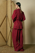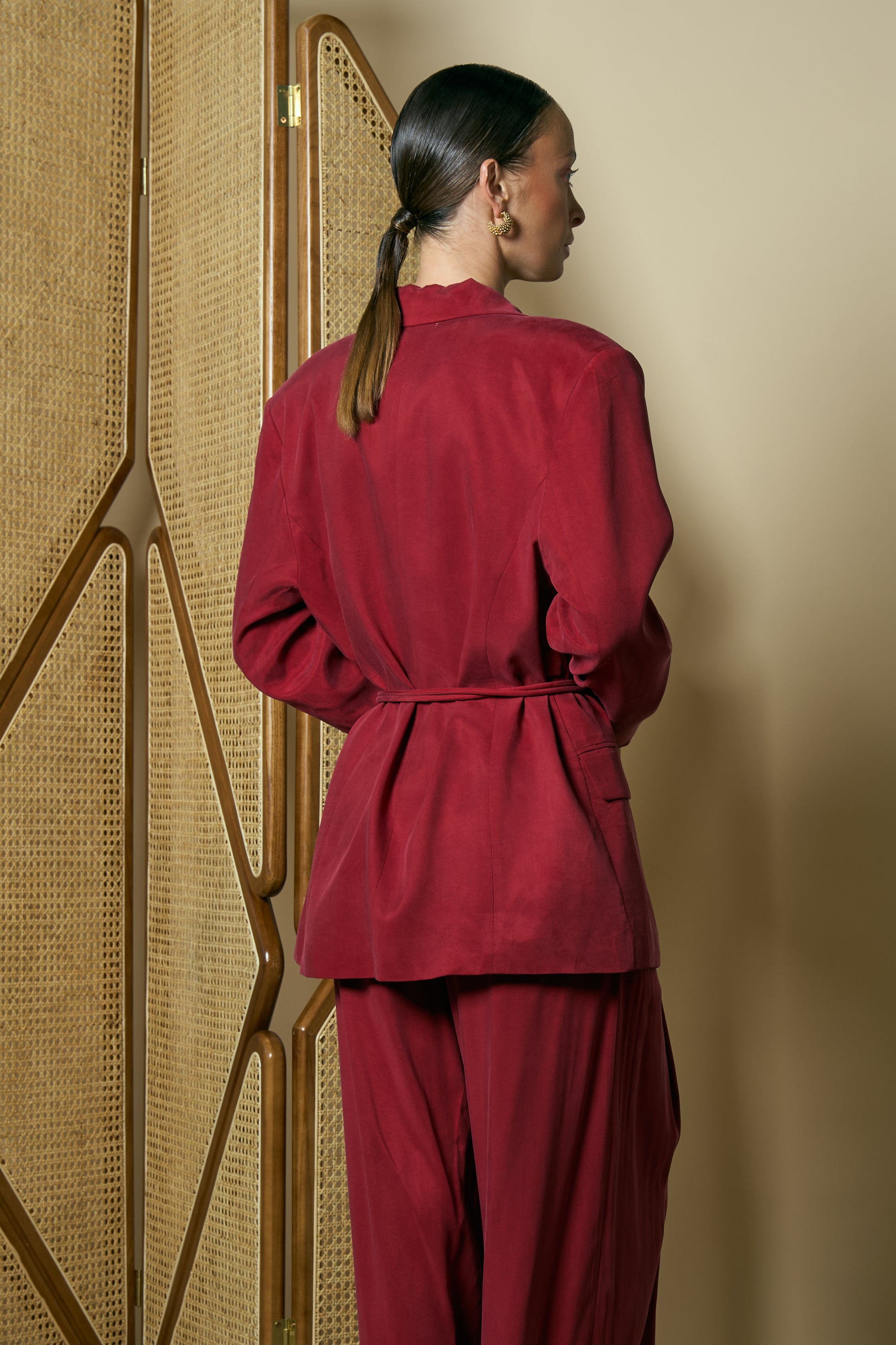 Oversized red blazer featuring a matching belt combining bold color with a tailored, cinched-waist silhouette for a statement look