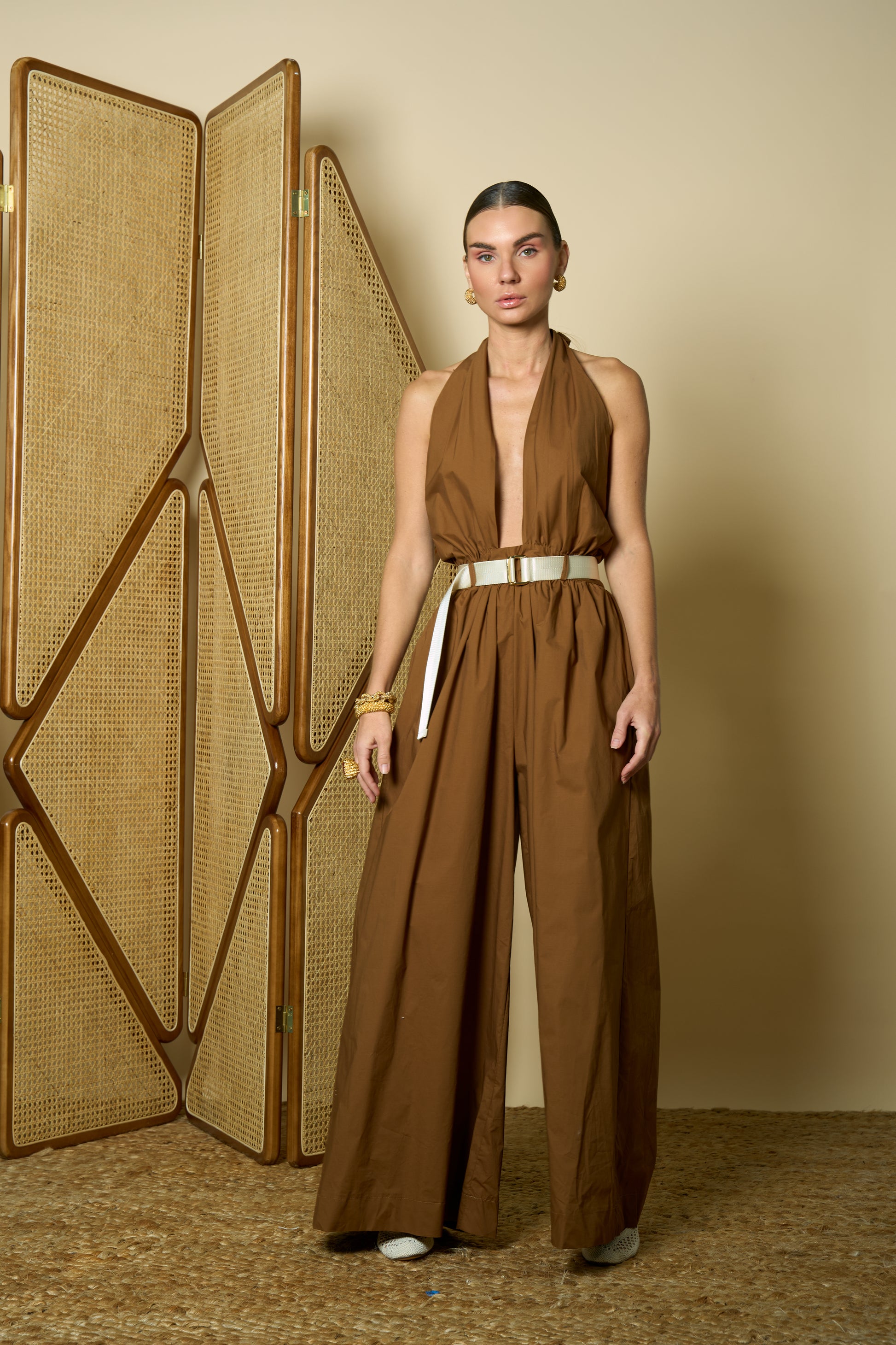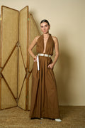 Elegant mocha halter-neck jumpsuit featuring a daring deep V.