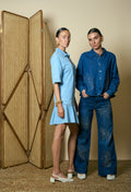 Short denim dress with a flared hem, V-neckline and short sleeves, a feminine take on timeless casual style.