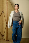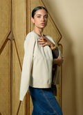 Cream long-sleeve sweater with silver front buttons for a polished, versatile look.