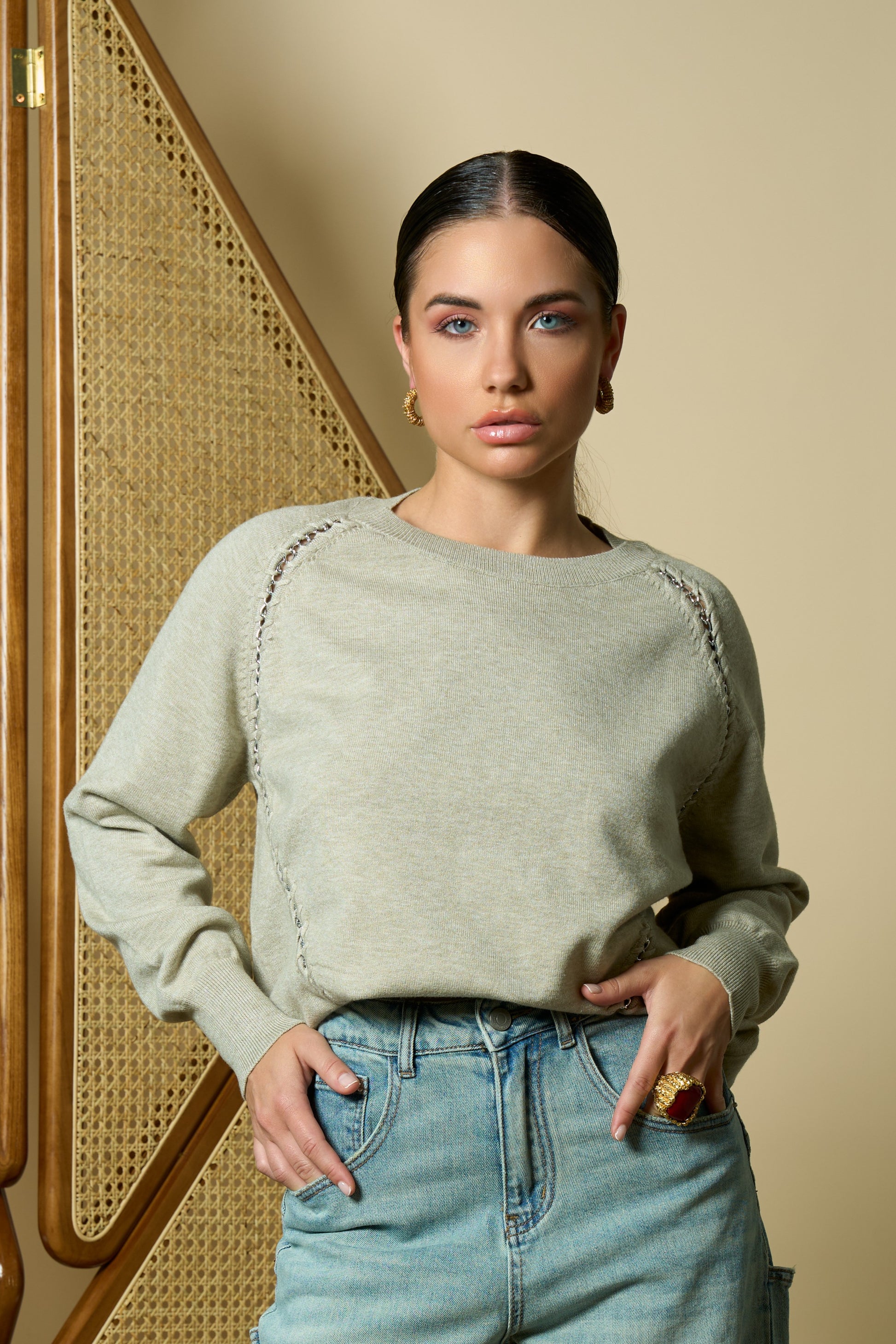 Oat-color long-sleeve sweater featuring side chain details for a chic, modern touch.