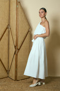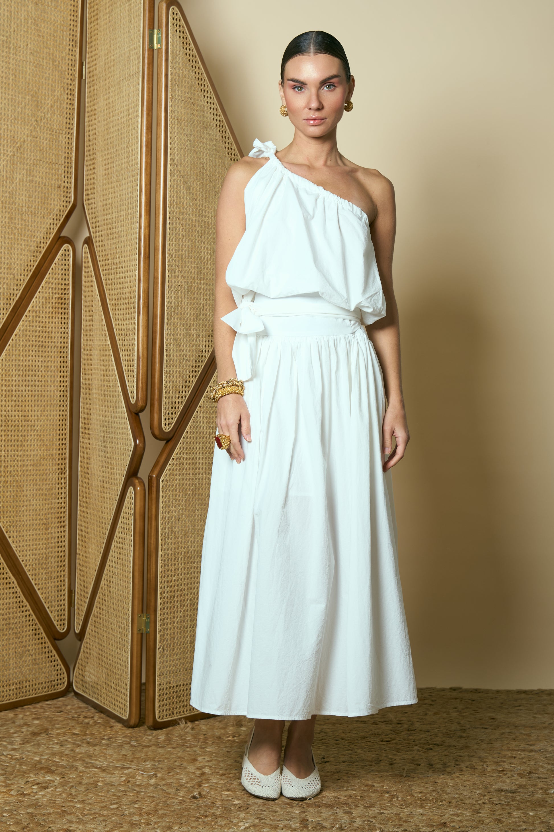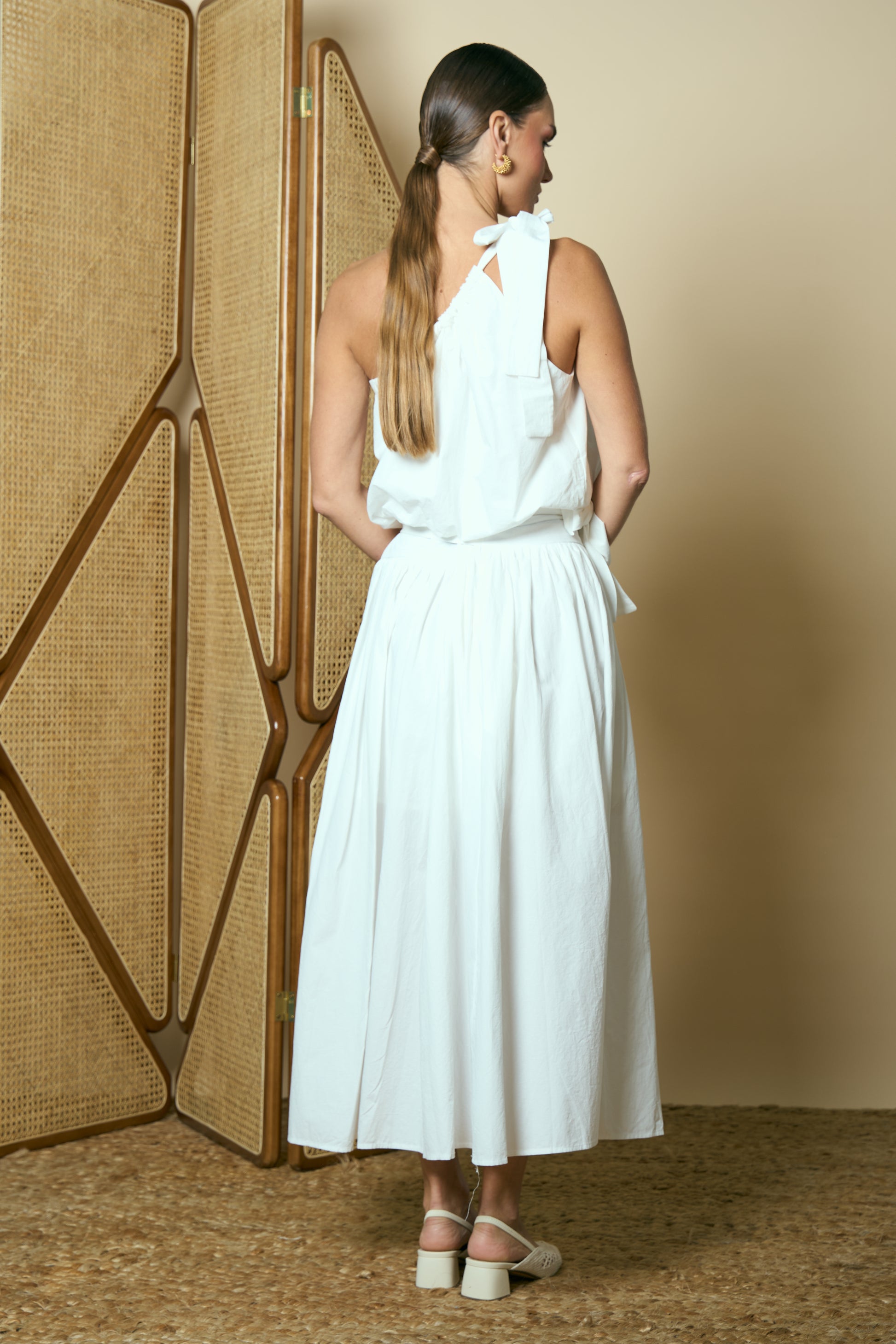 White cotton set featuring a sleeveless top with a side tie detail on one shoulder and a matching long skirt with an adjustable waist tie for a relaxed yet elegant look.