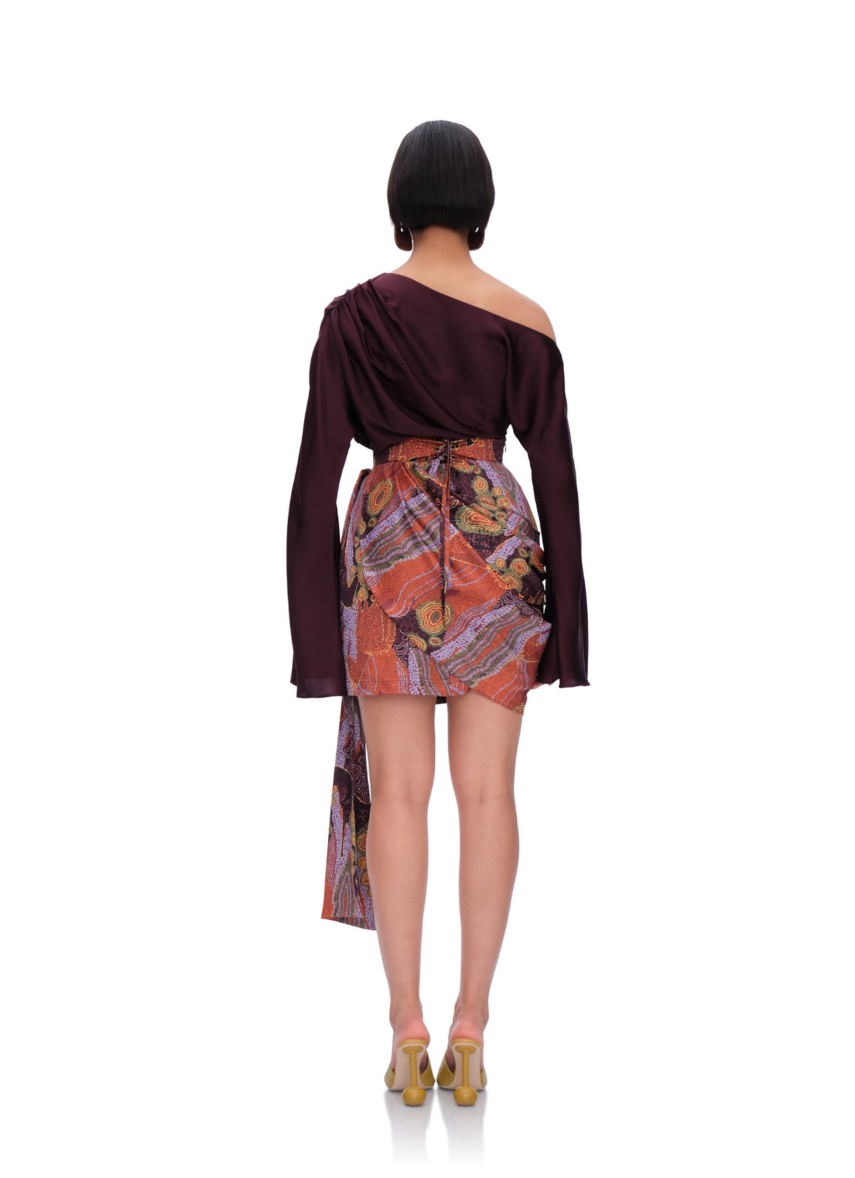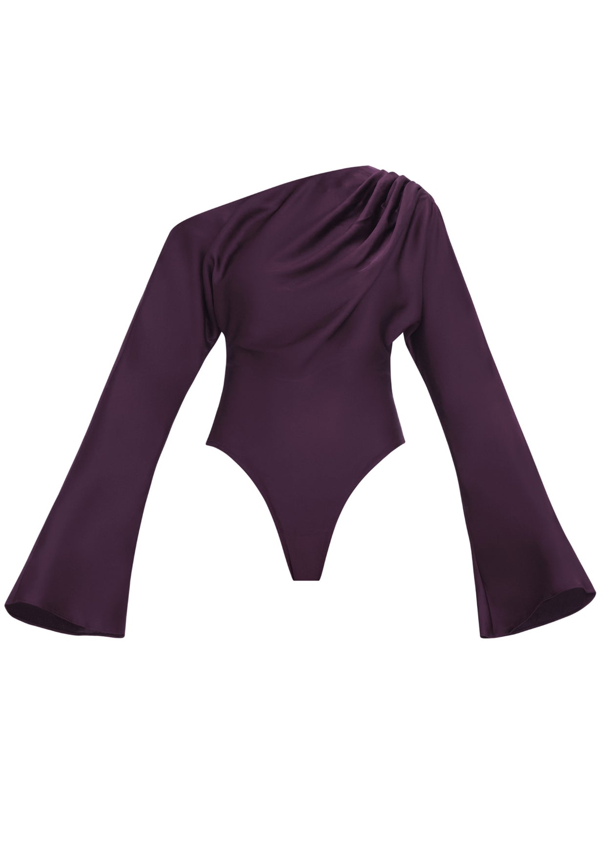 The MATI OFF-SHOULDER bodysuit Berry is executed with a luscious silk satin finish fabric that graces the upper body beautifully . Designed with a flute long sleeve this lightweight, bodysuit lets you layer creatively.