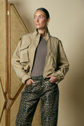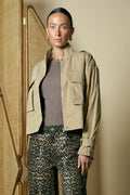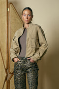 Beige waist-length military-style jacket featuring adjustable wrist straps, front flap pockets and a structure yet versatile Desing fo a timeless utilitarian look.