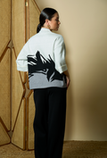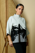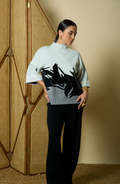 Cropped oversized color-block knit sweater off white and grey, black sequin appliqués and a turtleneck.