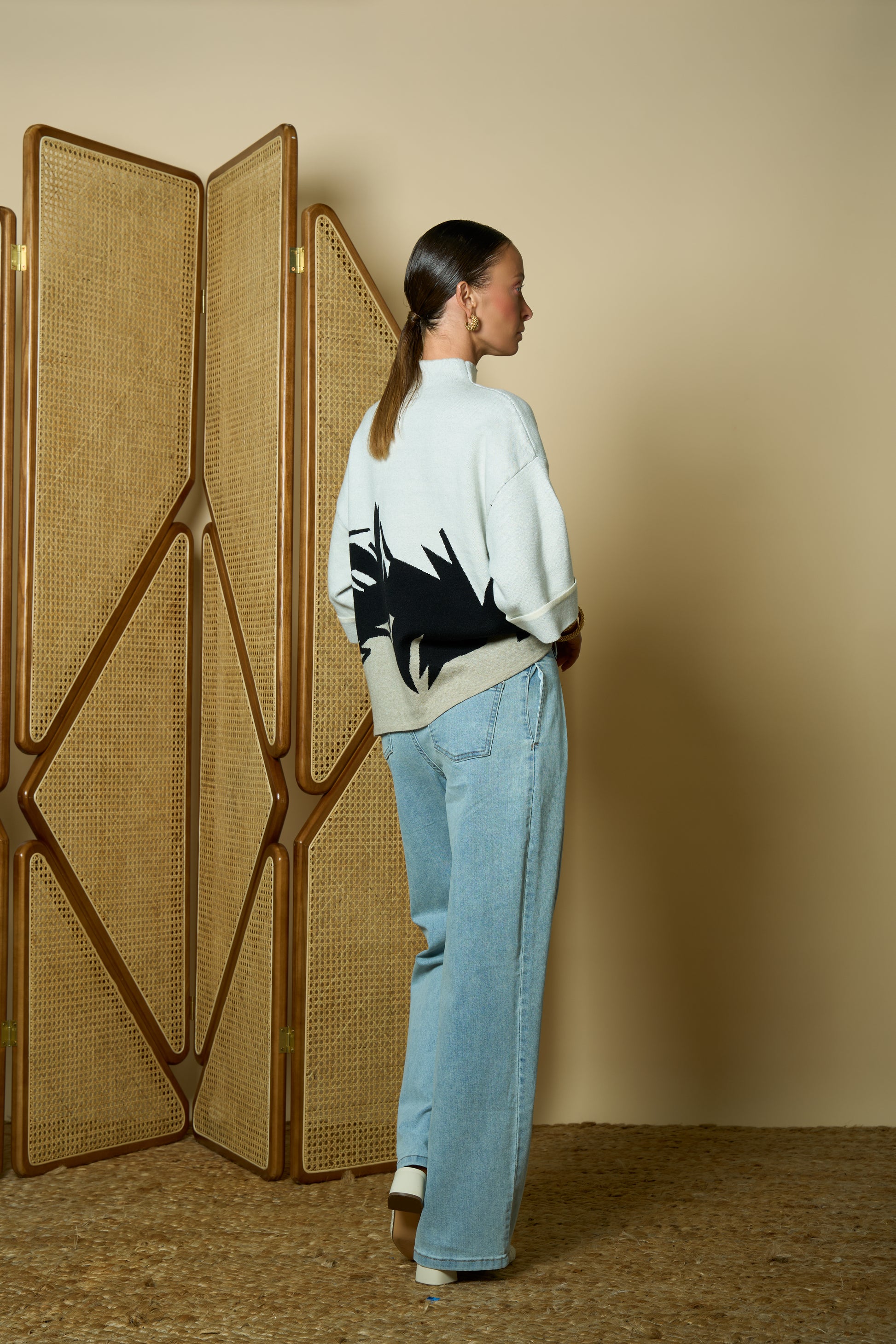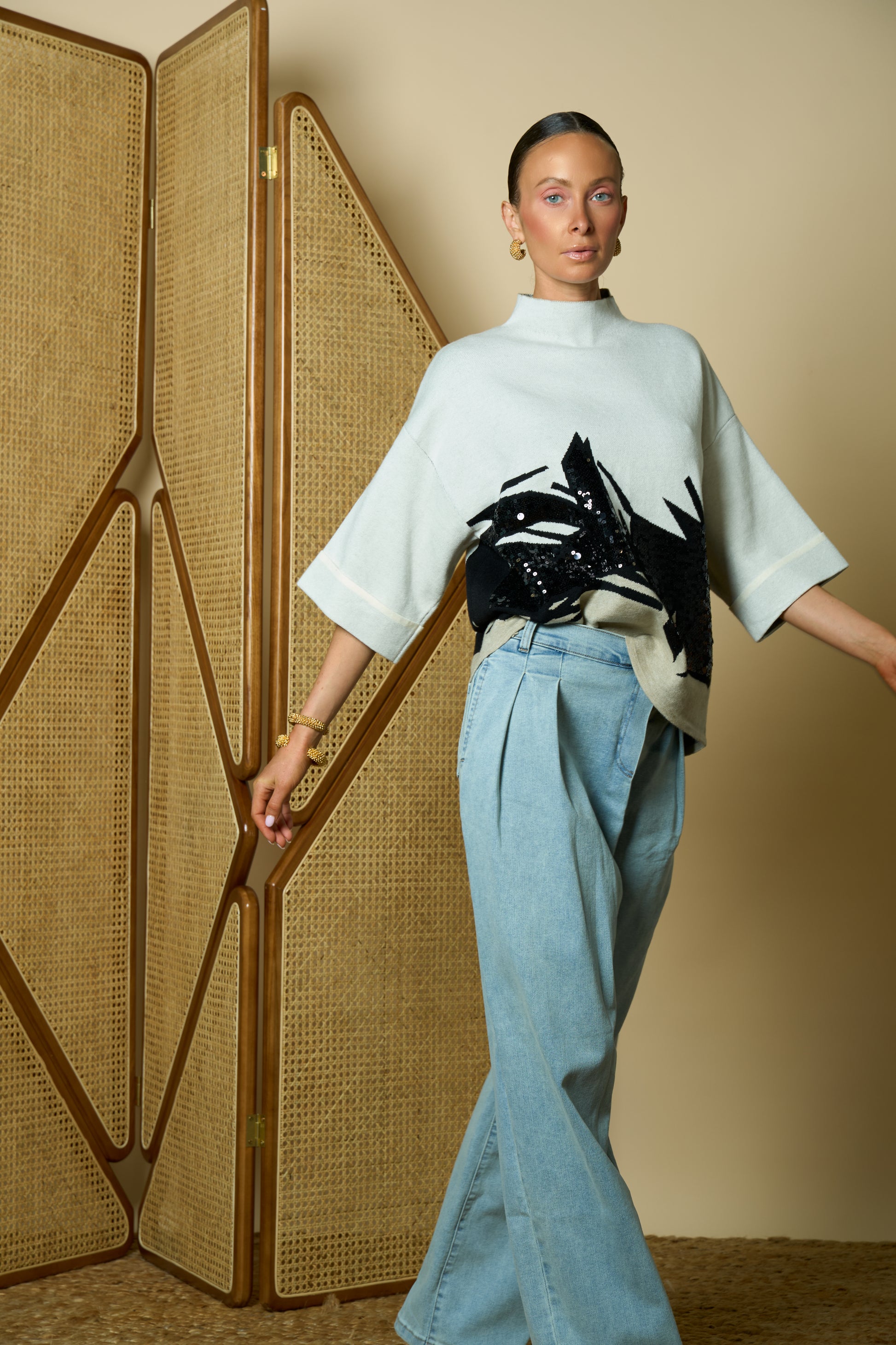 Oversized turtleneck sweater with color block and sequin