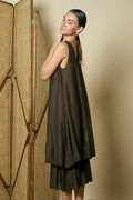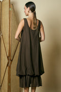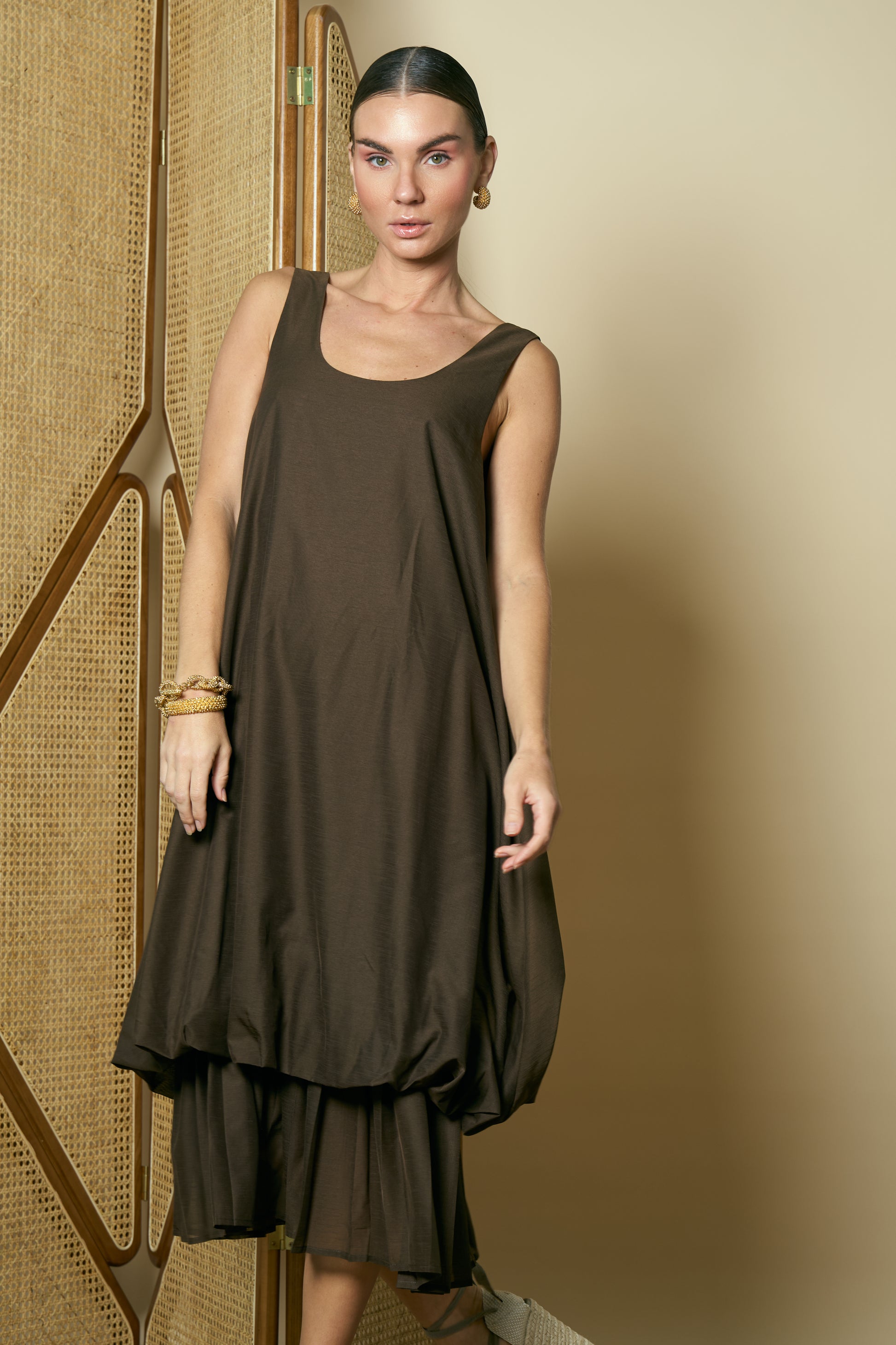 Sleeveless ballon-style long dress in chocolate brown, featuring a voluminous skirt for a playful yet elegant silhouette