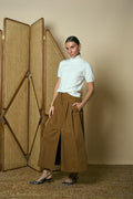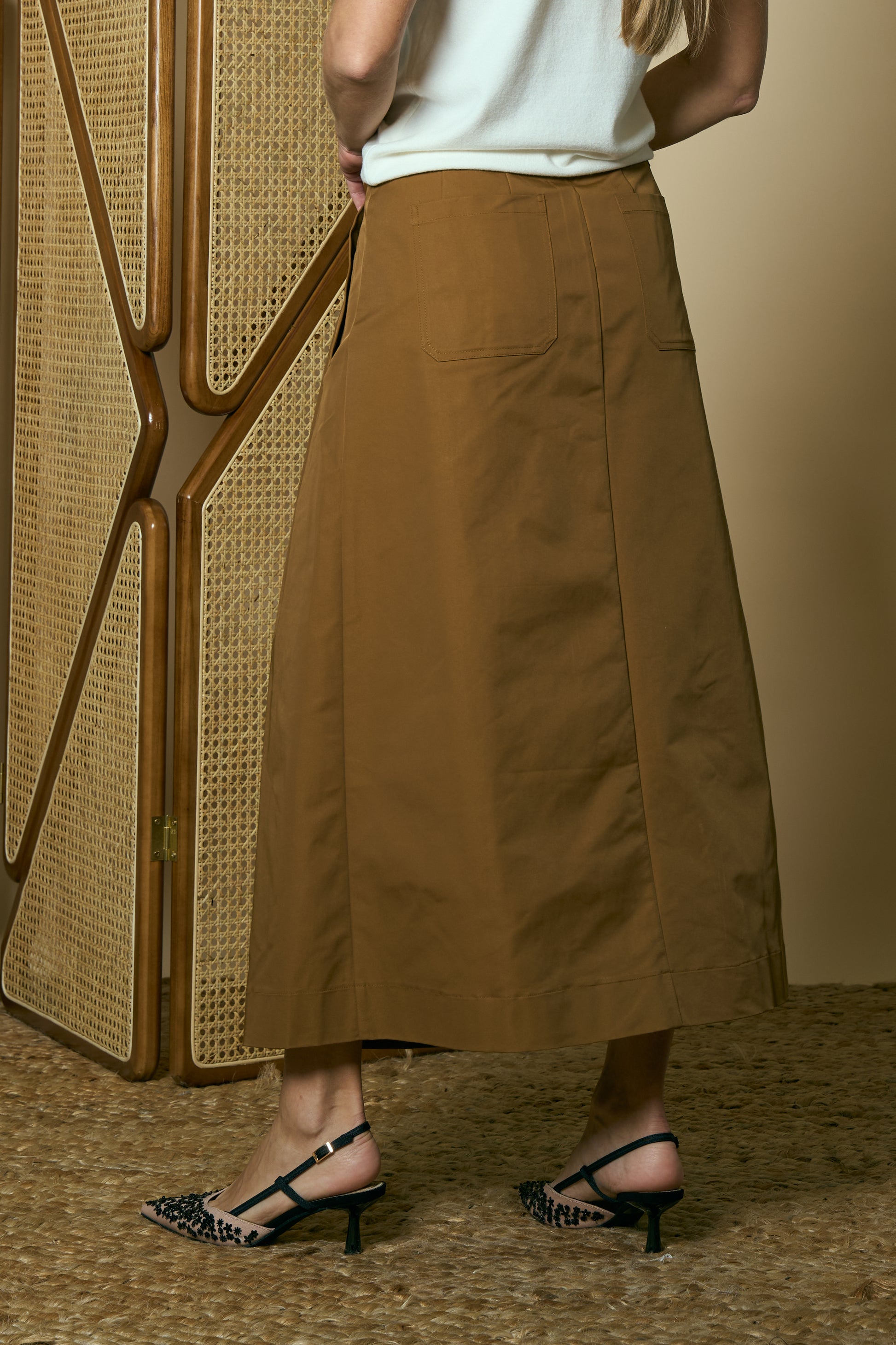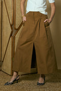Mocha-colored midi-skirt featuring front pleats, side pockets and a chic front slit for a refined yet modern touch