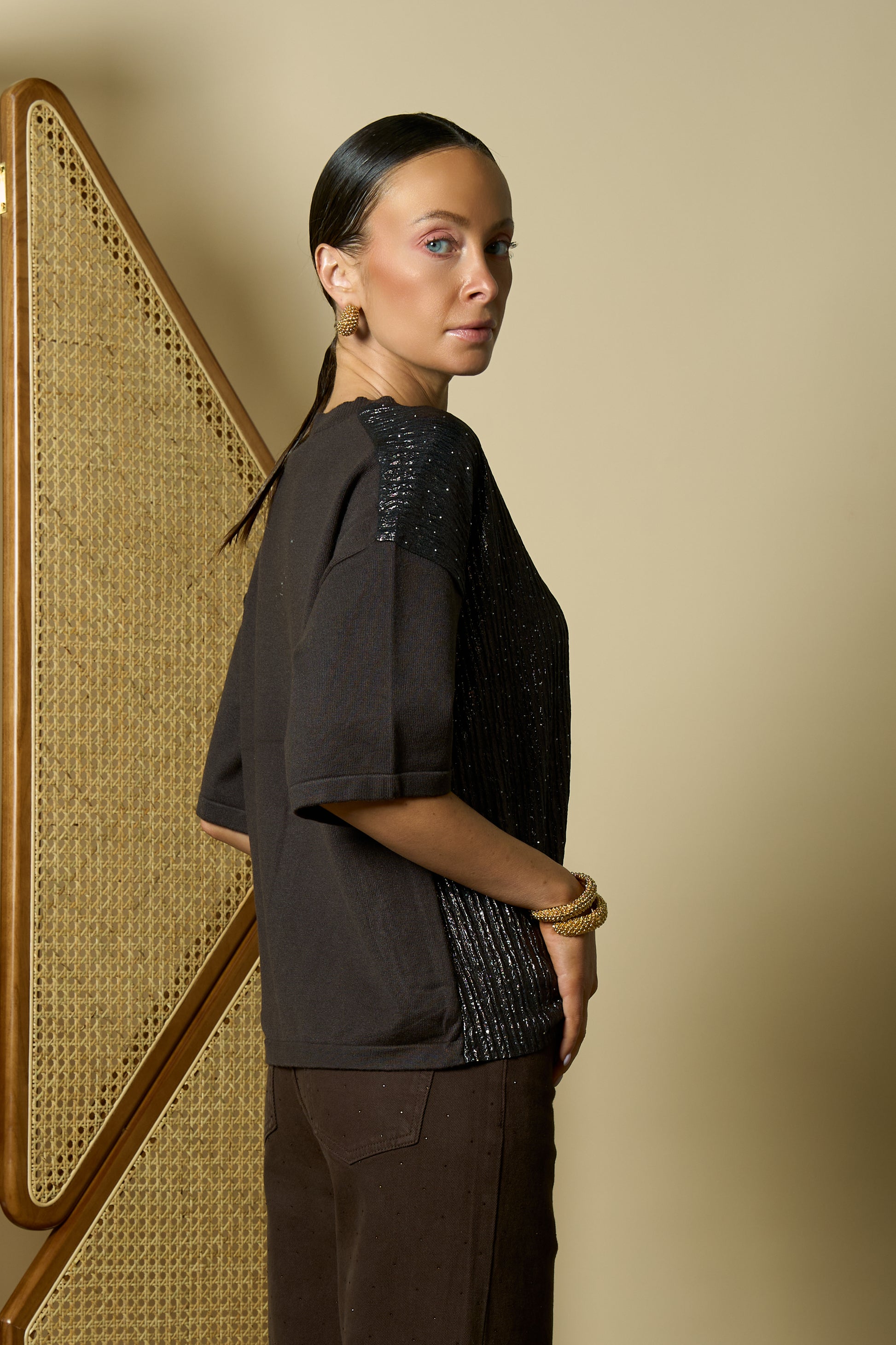 Knit T-shirt with a subtle lurex shine at the front.