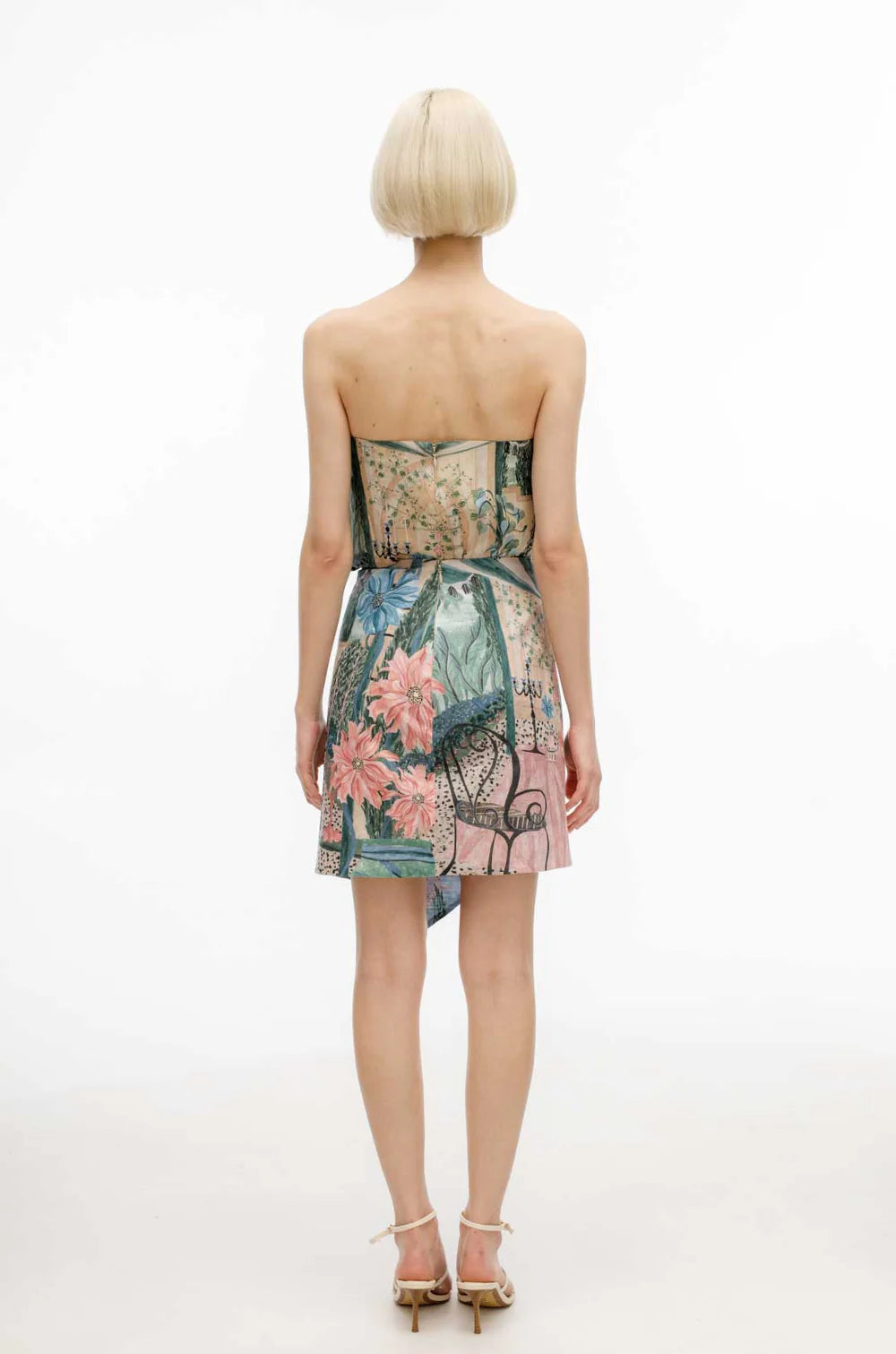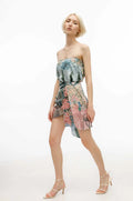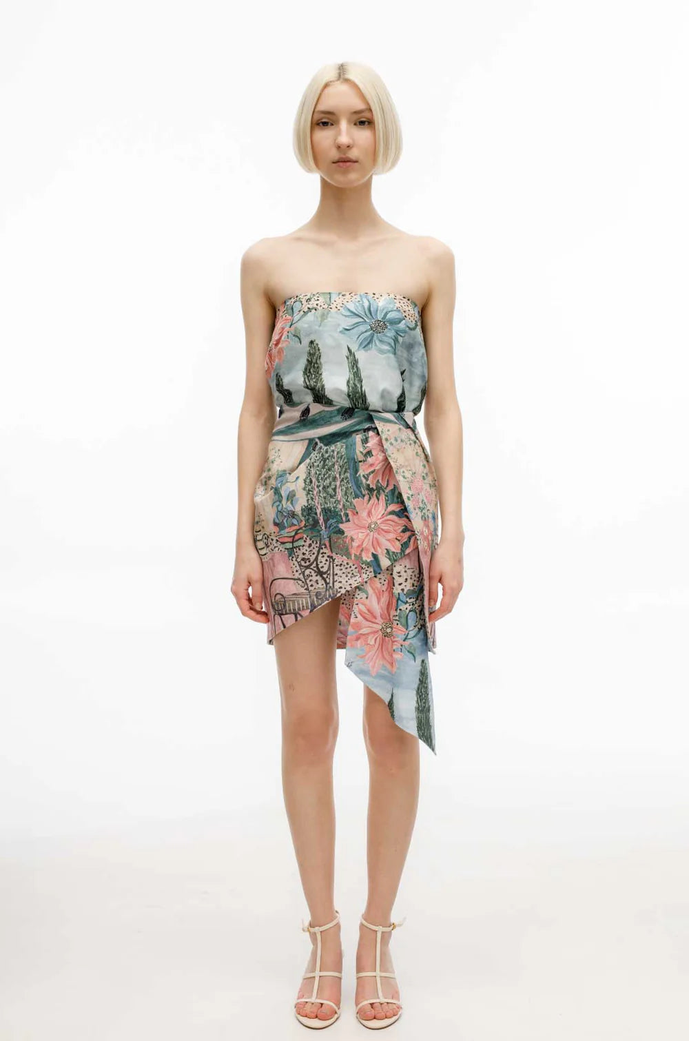 Mid-rise, straight silhouette, front draped, mini length.