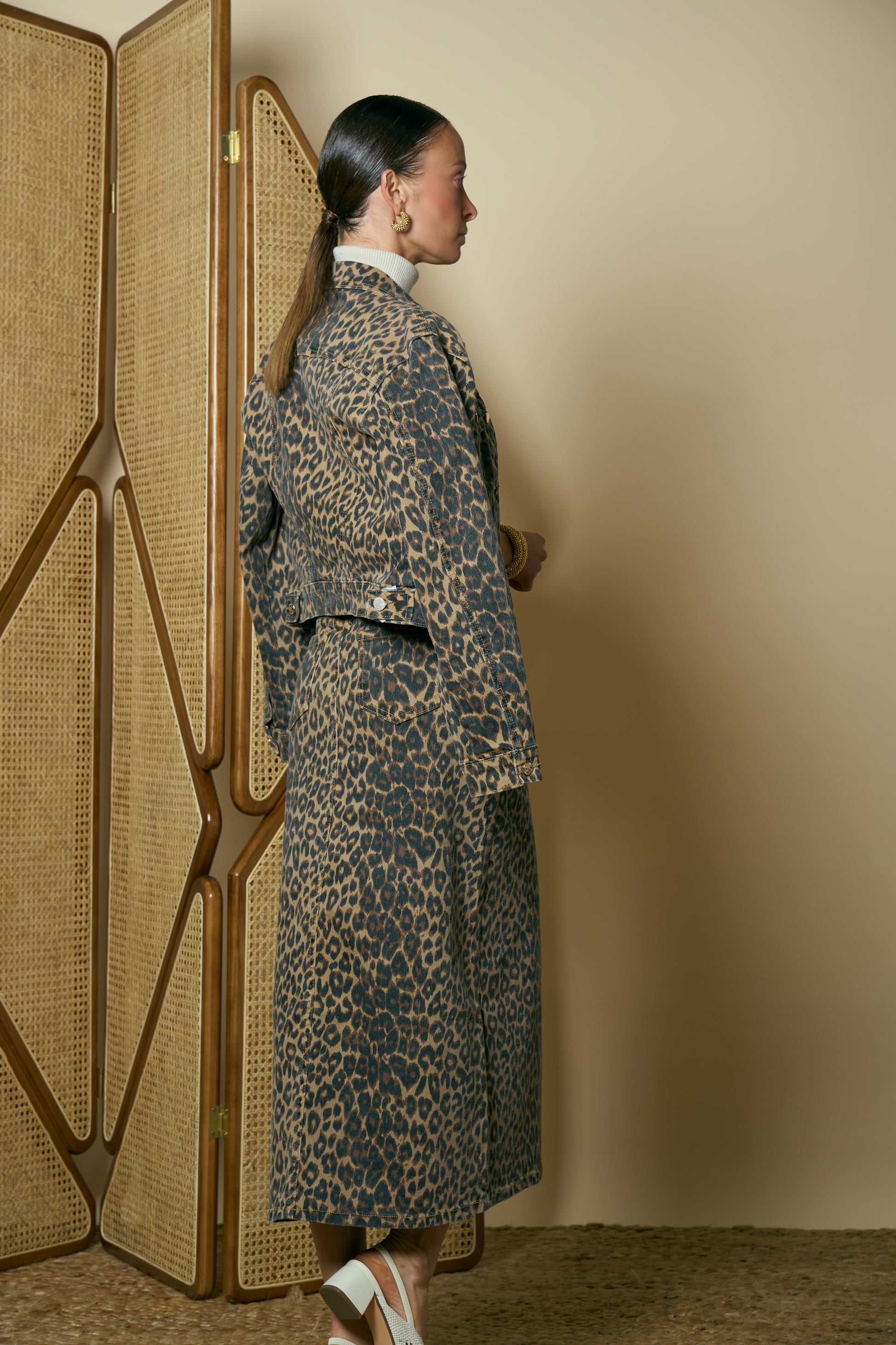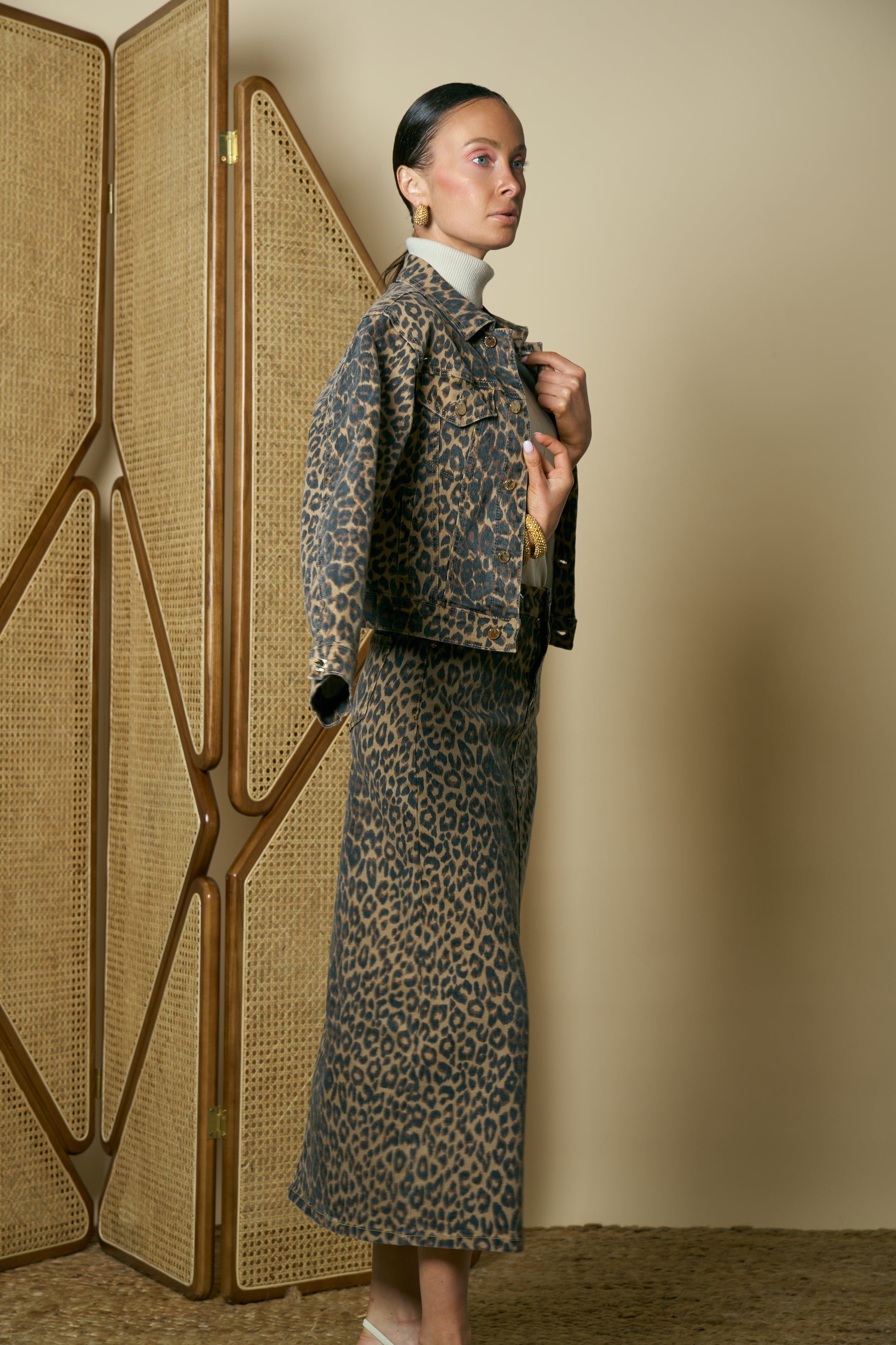 Denim jacket featuring a bold animal print Desing, blending classic denim style with a fierce contemporary twist.