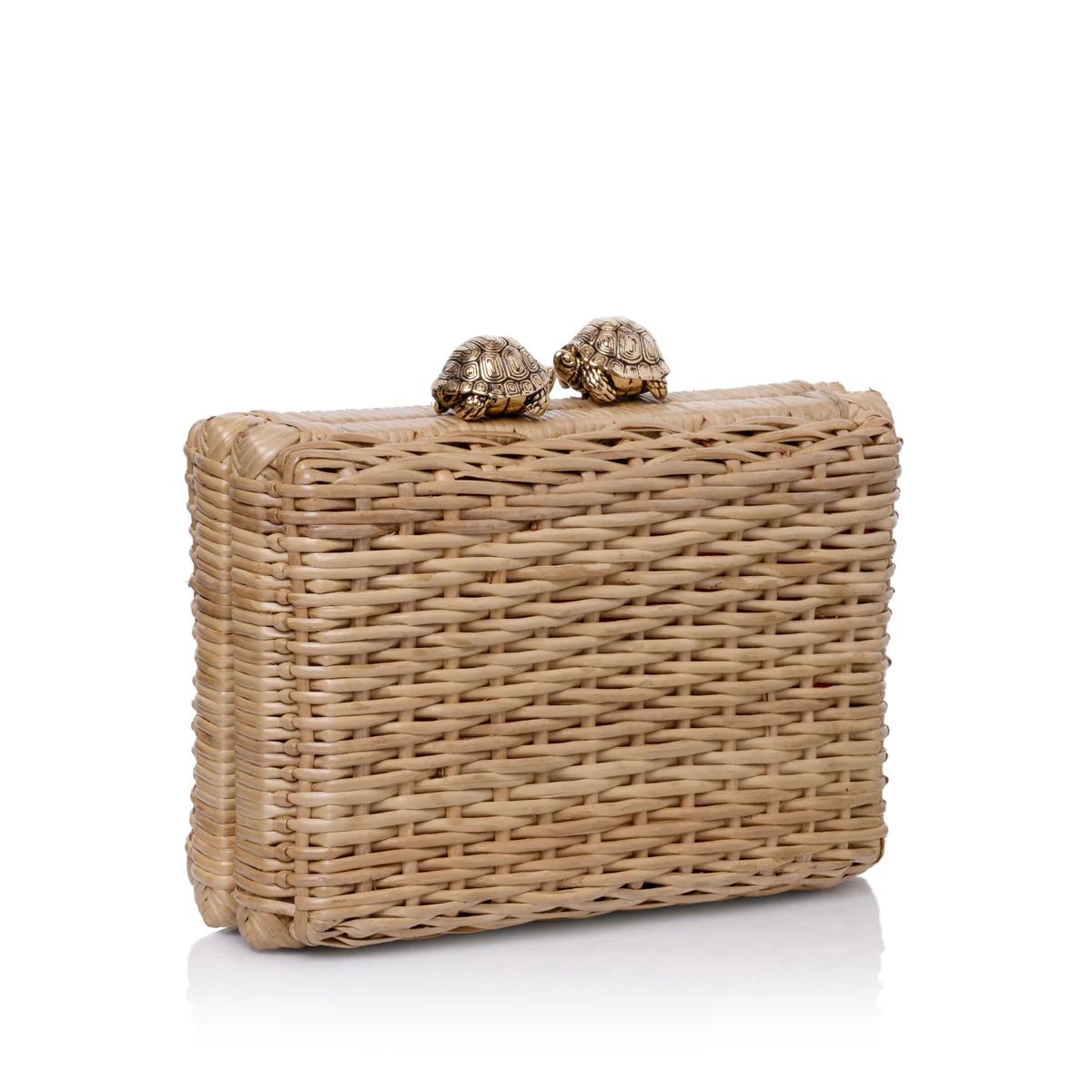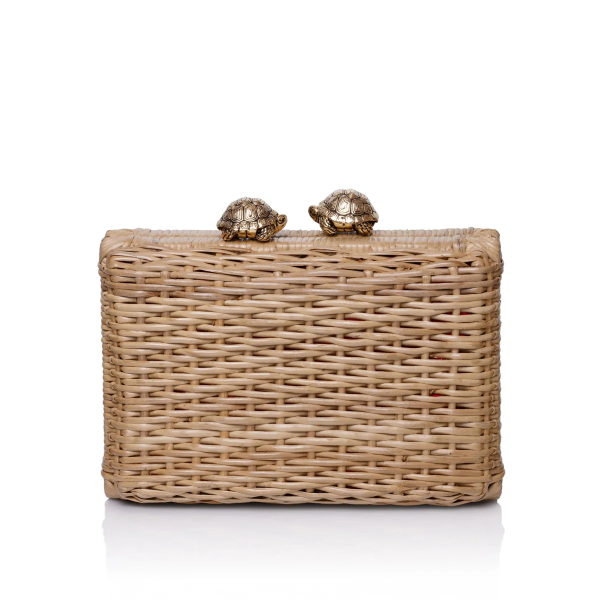 Handbag with metal frame covered in hand-woven rattan and hand-painted ceramic ornament. With red suede lining.