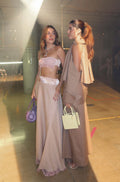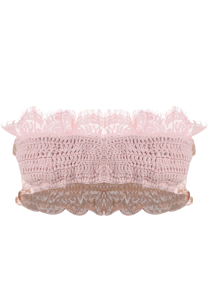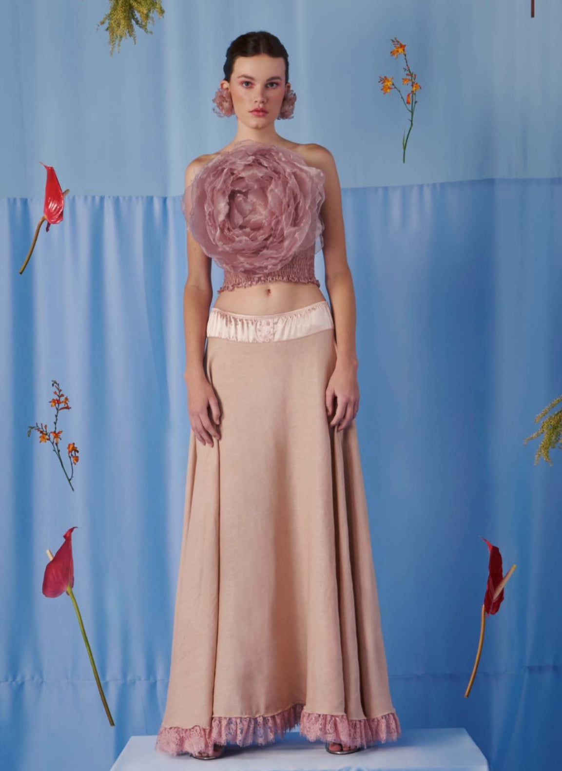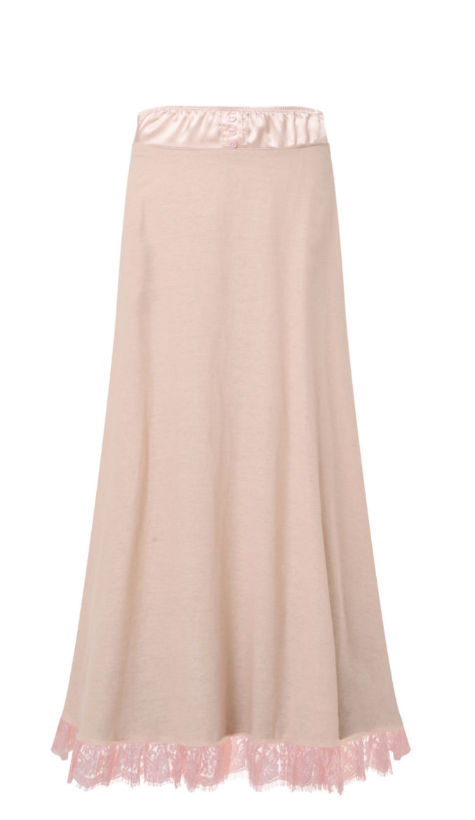 Elegant and dreamy a matching top and long pink skirt with delicate lace detailing perfect for a timeless, romantic look