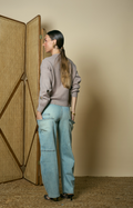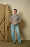 Gray sweater featuring open metallic ring details o the front, adding a modern and stylish touch