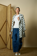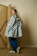 Polka-dot trench coat featuring a classic silhouette with a playful timeless pattern.